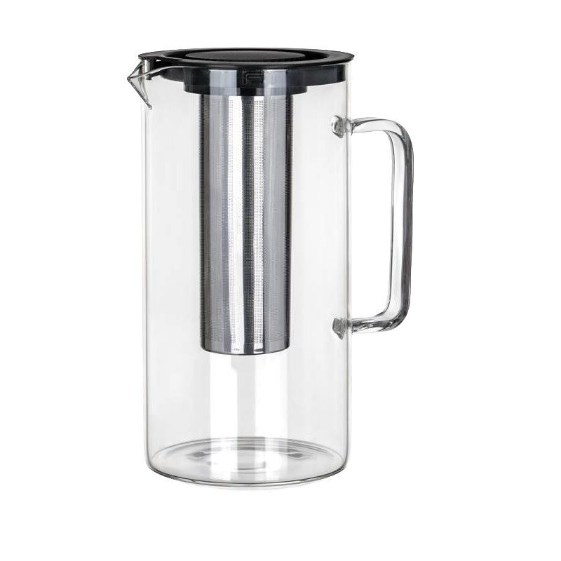 Skleněný džbán 2,5 l s plastovým víčkem a nerezovým sítkem je vhodný k podávání studených i teplých nápojů.