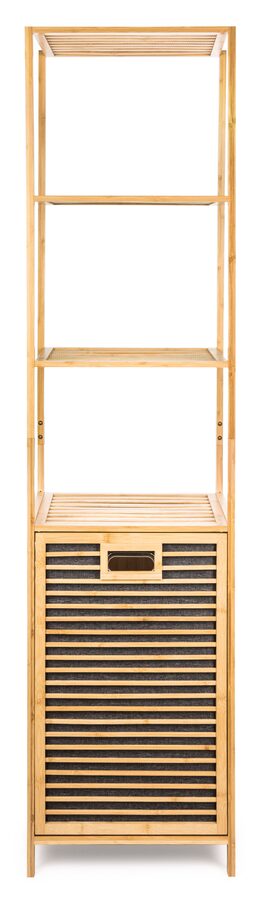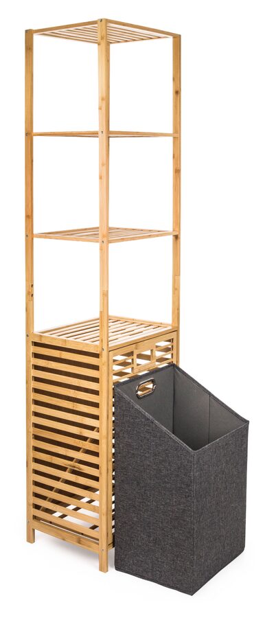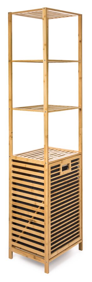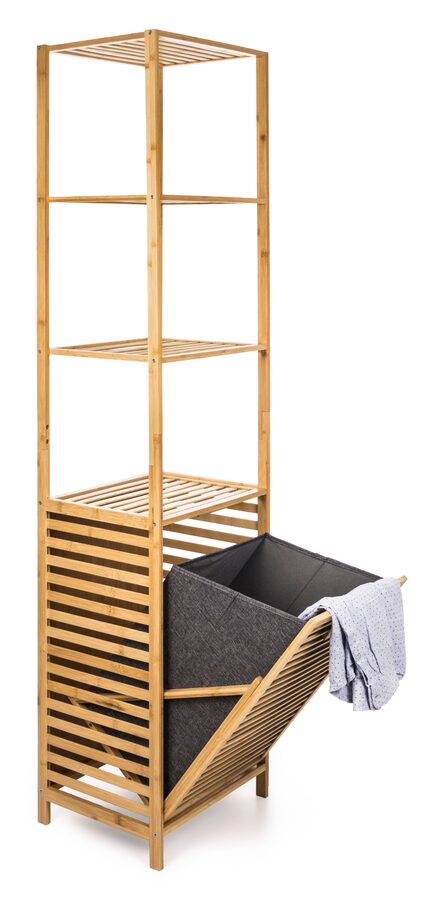 Praktický stojan se 4 policemi a výklopným košem na prádlo je skvělým řešením. Ušetří spoustu místa a uložíte do něj vše, co potřebujete. Potřeby na praní nebo kosmetiku, koupelnové vybavení a ručníky nebo úklidové prostředky. Každá z polic unese až 10 kg zátěže. Jedna z nich tvoří zároveň víko koše na špinavé prádlo s látkovou vložkou ve spodní části stojanu.