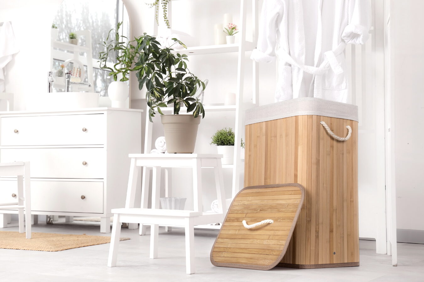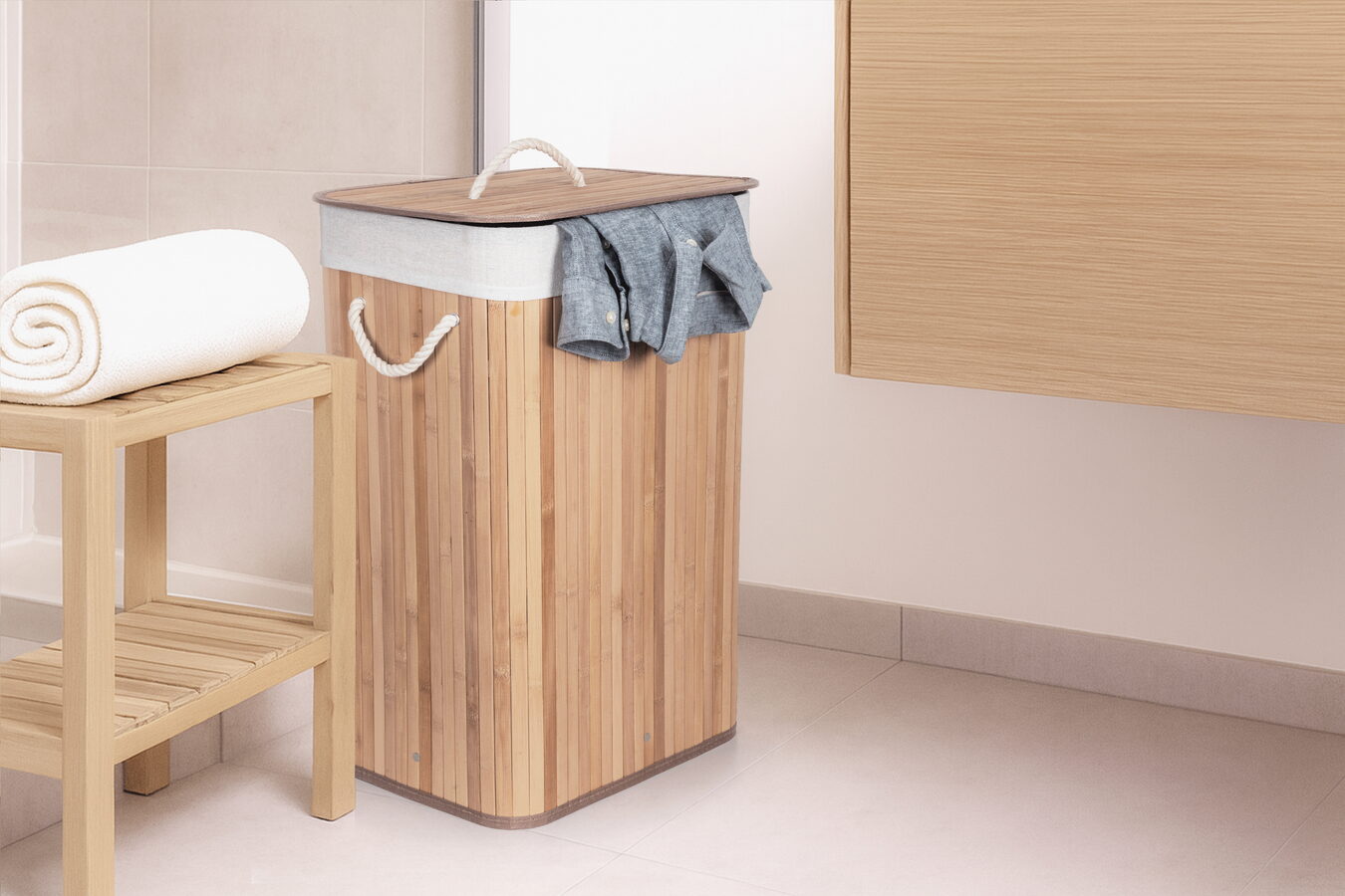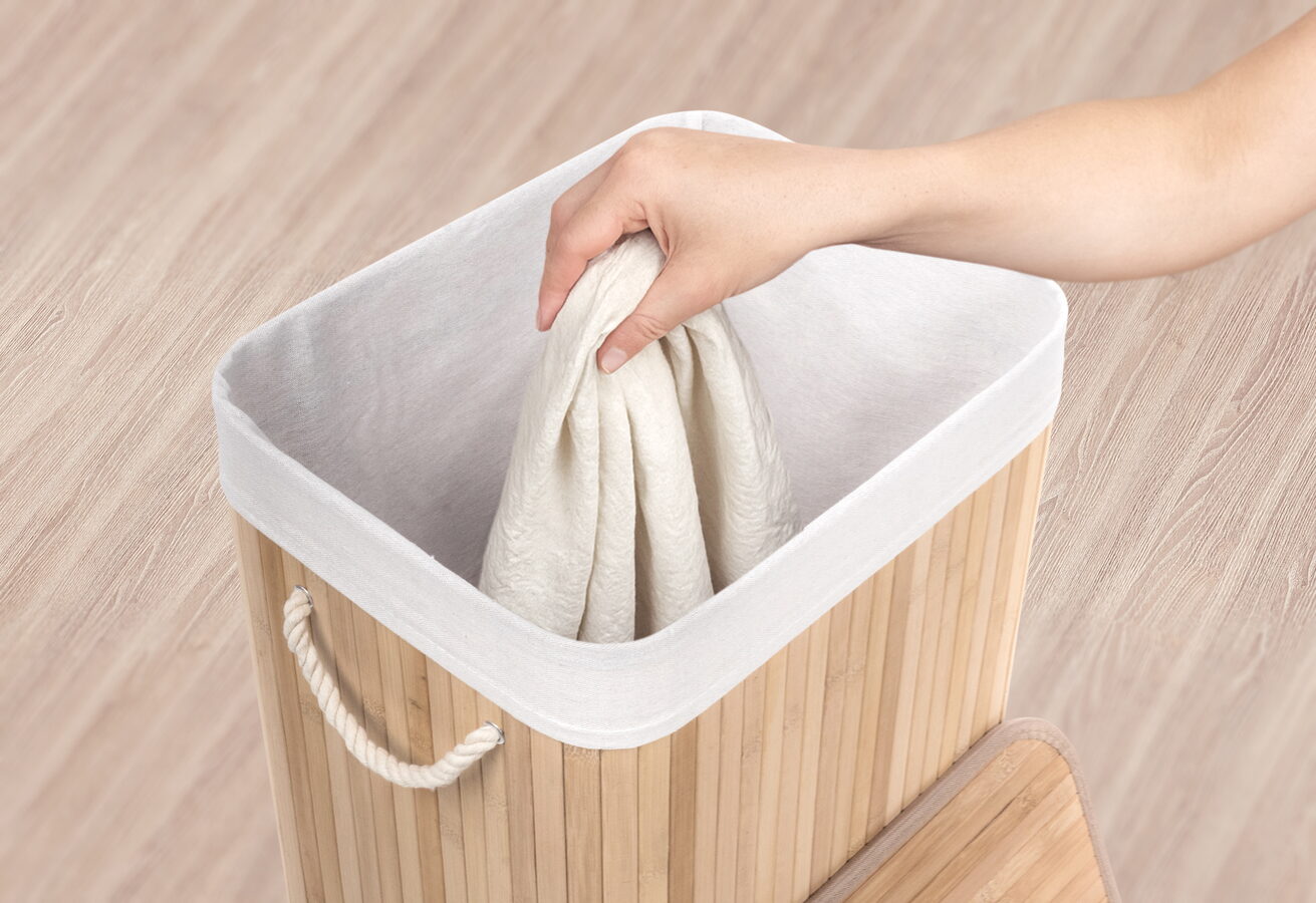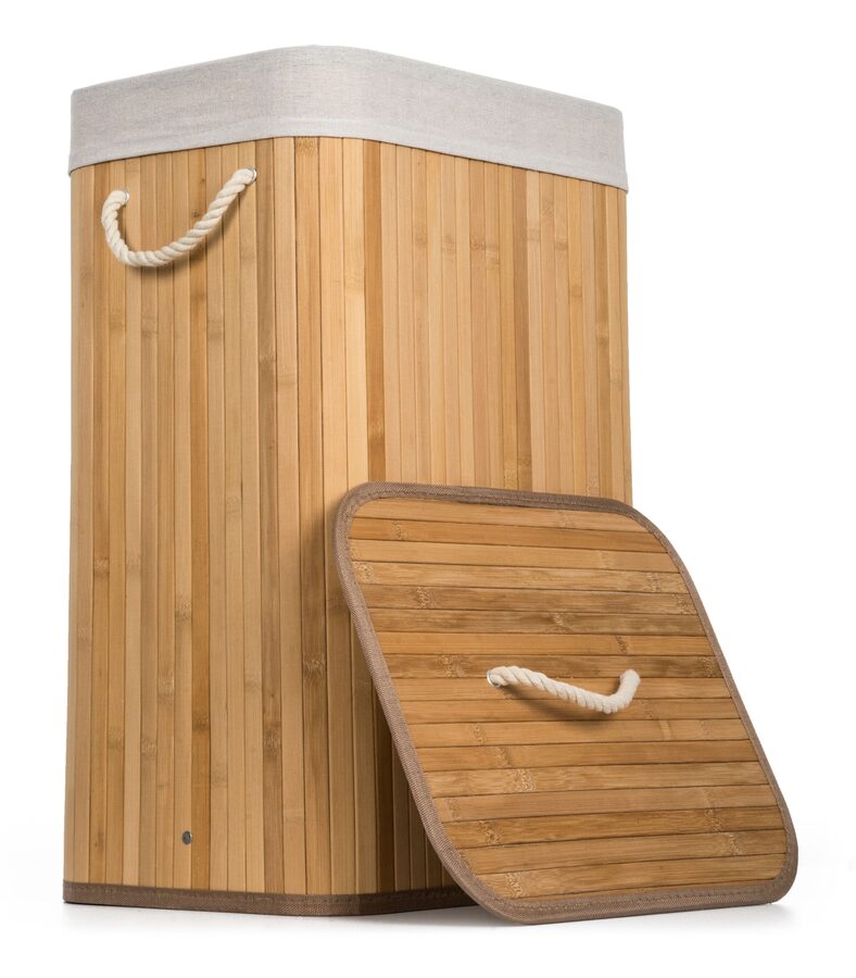 Jak vybrat nejlepší koš na špinavé prádlo? Co se materiálu koše týče, doporučujeme jednoznačně bambus. Je odolný vůči vlhkosti, takže jej můžete bez obav umístit do koupelny nebo servisní místnosti s pračkou. Zároveň je i vizuálně velmi příjemný – kombinace přírodního materiálu a bílé vložky a madel evokuje pocit čistoty, navíc se i hodí k jakémukoliv interiéru.