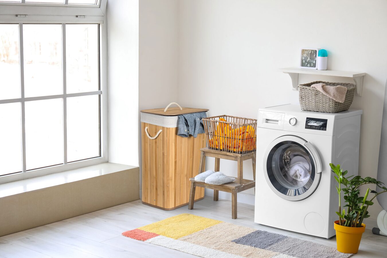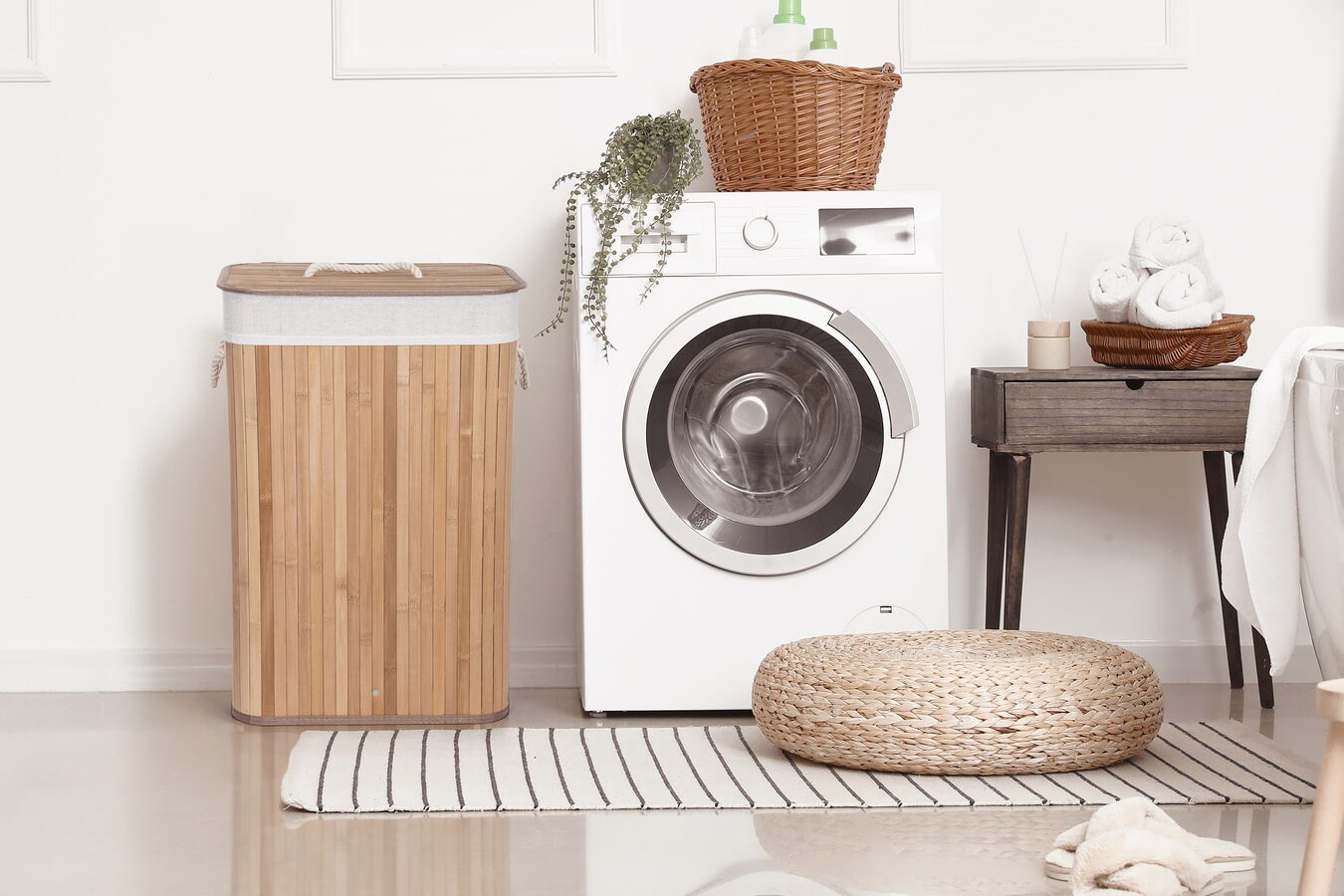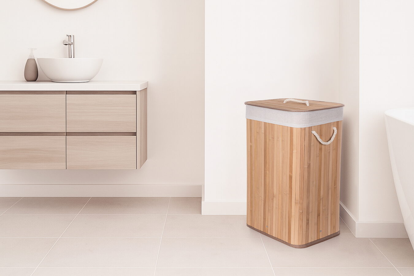 Jak vybrat nejlepší koš na špinavé prádlo? Co se materiálu koše týče, doporučujeme jednoznačně bambus. Je odolný vůči vlhkosti, takže jej můžete bez obav umístit do koupelny nebo servisní místnosti s pračkou. Zároveň je i vizuálně velmi příjemný – kombinace přírodního materiálu a bílé vložky a madel evokuje pocit čistoty, navíc se i hodí k jakémukoliv interiéru.