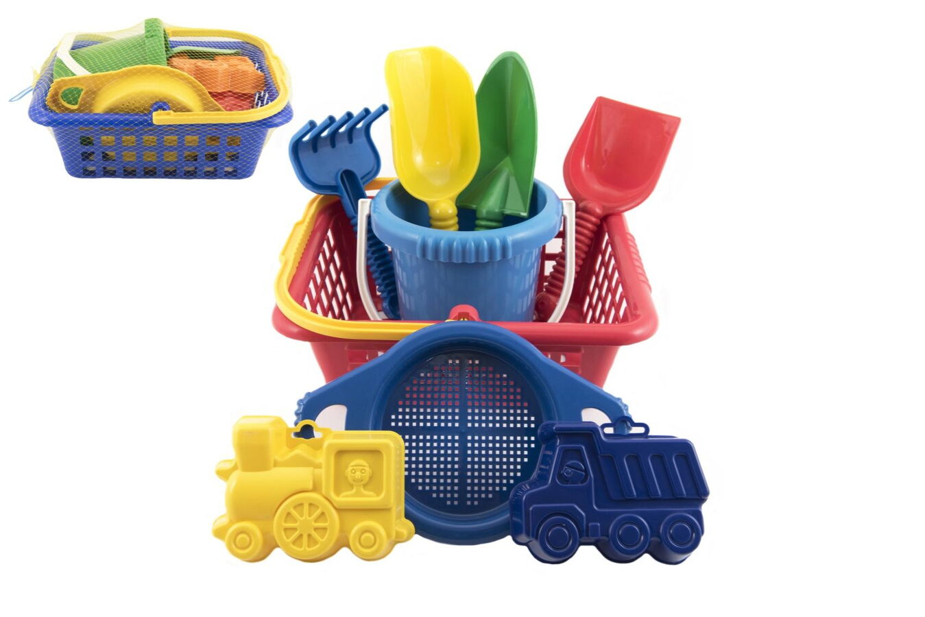 Sada na písek. Sada obsahuje košík, kyblík, 2 bábovky, rýč, lopatku a sítko.