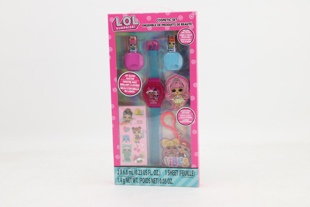 Kosmetická sada se se dvěma laky na nehty, rtěnkou v hodinkách, přívěskem a samolepkami. V designu L.O.L.