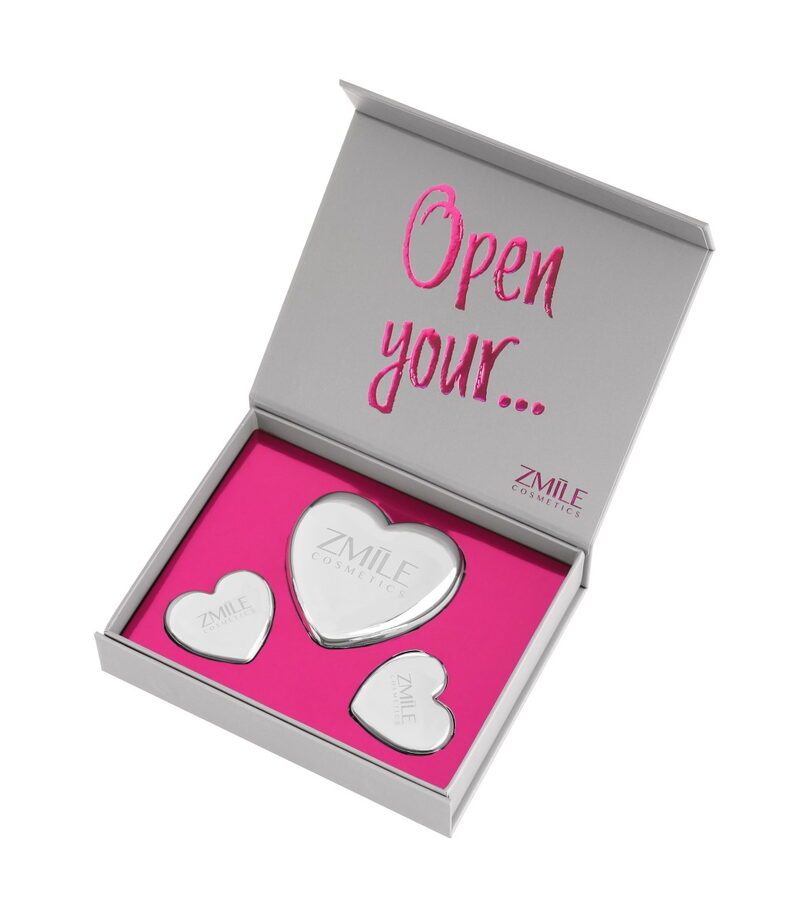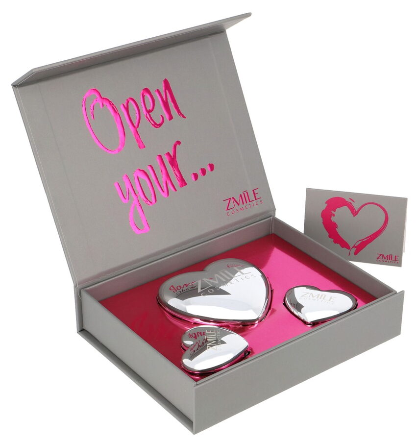 Kosmetická sada „Sweethearts Orchid Love“ – dárková sada obsahuje 3 kovová srdíčka – 1× tvářenka, 1× oční stíny a 1xrtěnka. Dermatologicky testováno, vyhovuje přísným normám EU.