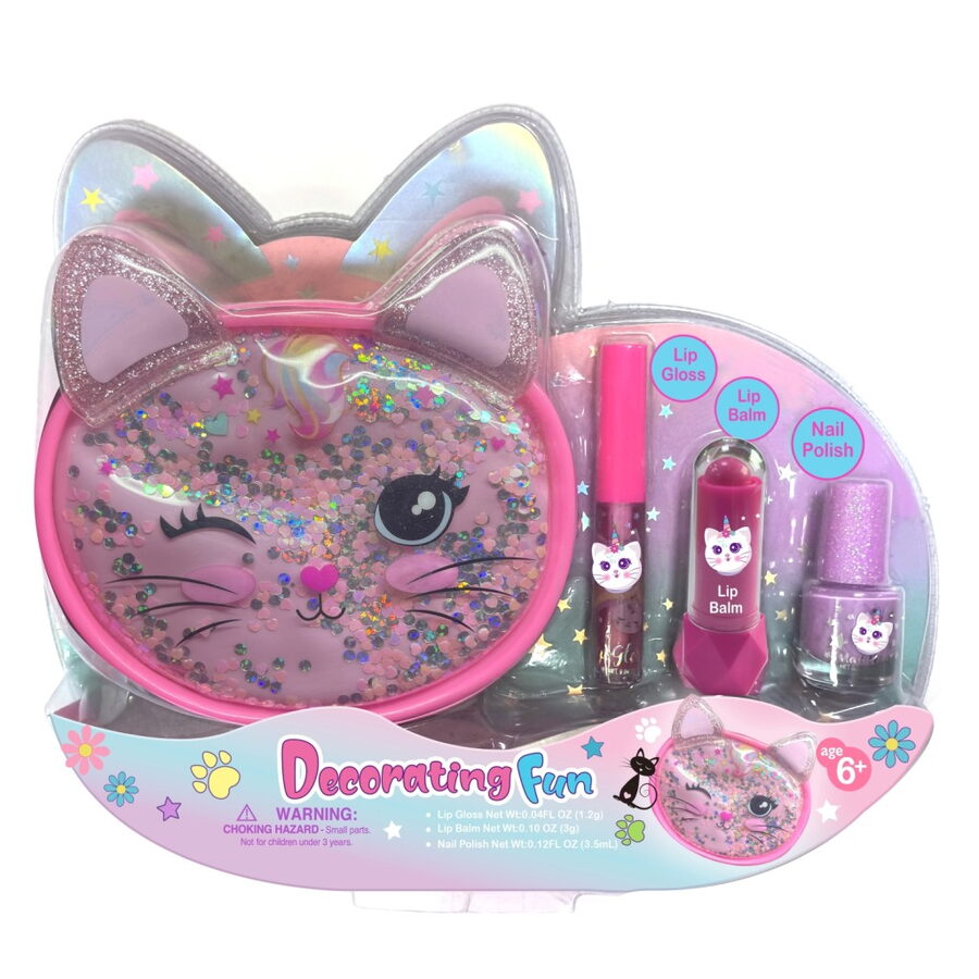 Kosmetická sada s taštičkou ve tvaru kočičky. V balení je balzám na rty, lesk na rty a lak na nehty. Vhodné pro děti od 6ti let.