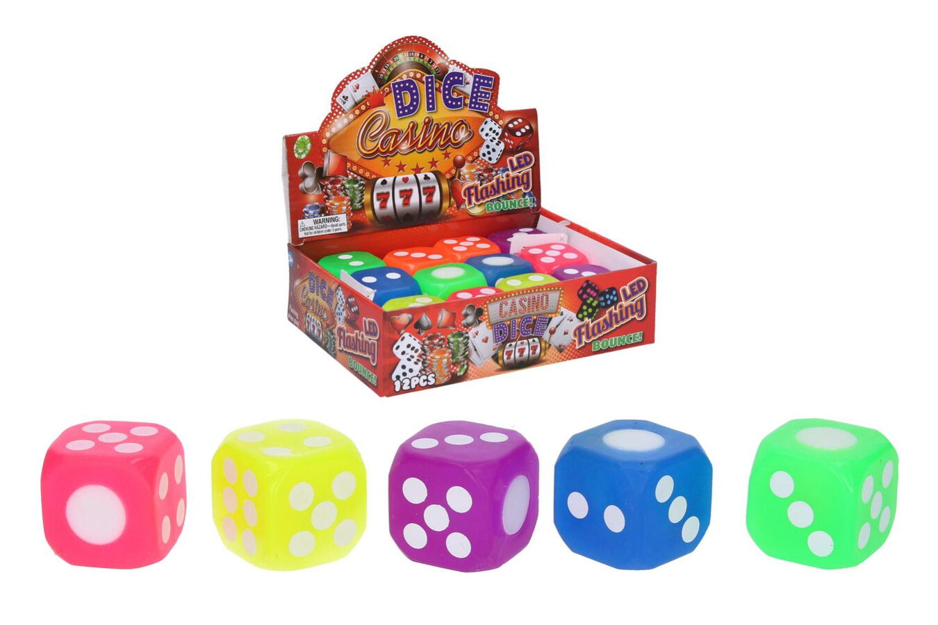 Kostka hrací. Velikost 4 cm. Světelné efekty, baterie nelze měnit. 12 ks display box. 6 variant - oranžová, modrá, zelená, žlutá, fialová, růžová.
