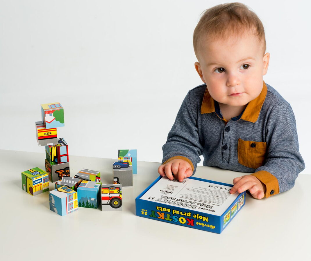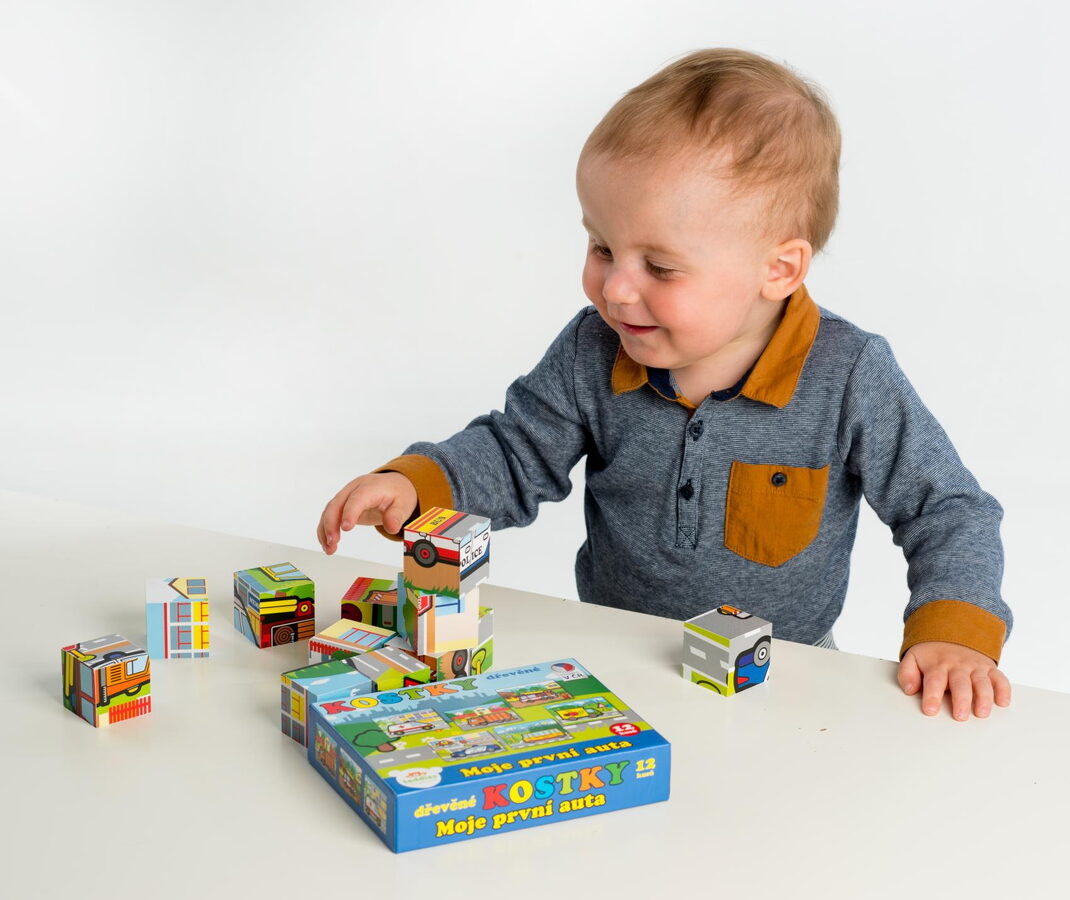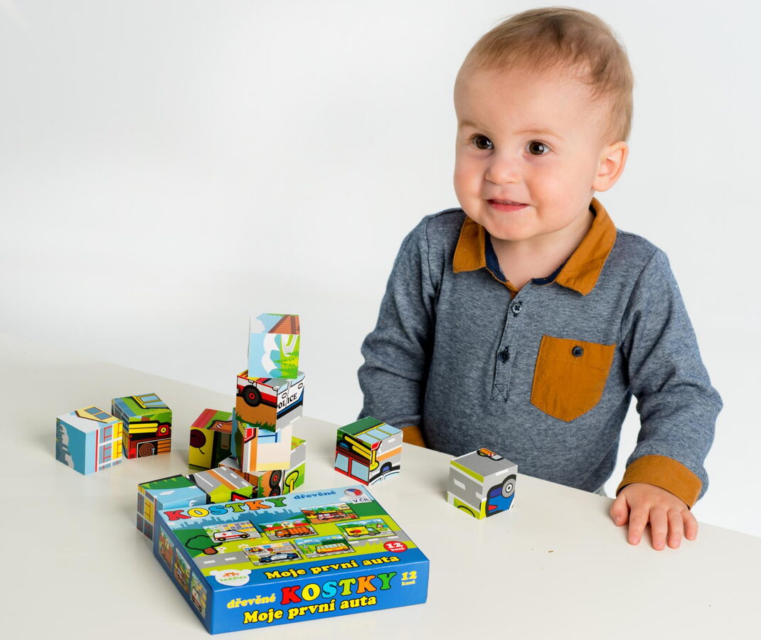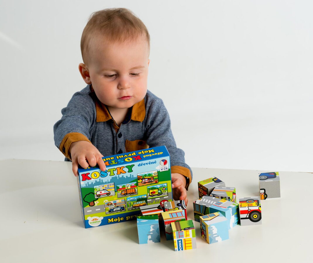 Obrázkové kostky s motivem dopravních prostředků jsou klasické dřevěné kostky s obrázky. Je to velmi oblíbená hra pro děti každého věku a při příjemné zábavě zároveň podporuje kombinační schopnosti a fantazii dítěte. Z kostek lze složit 6 různých obrázků. Obrázkové kostky jsou baleny v praktické krabičce.