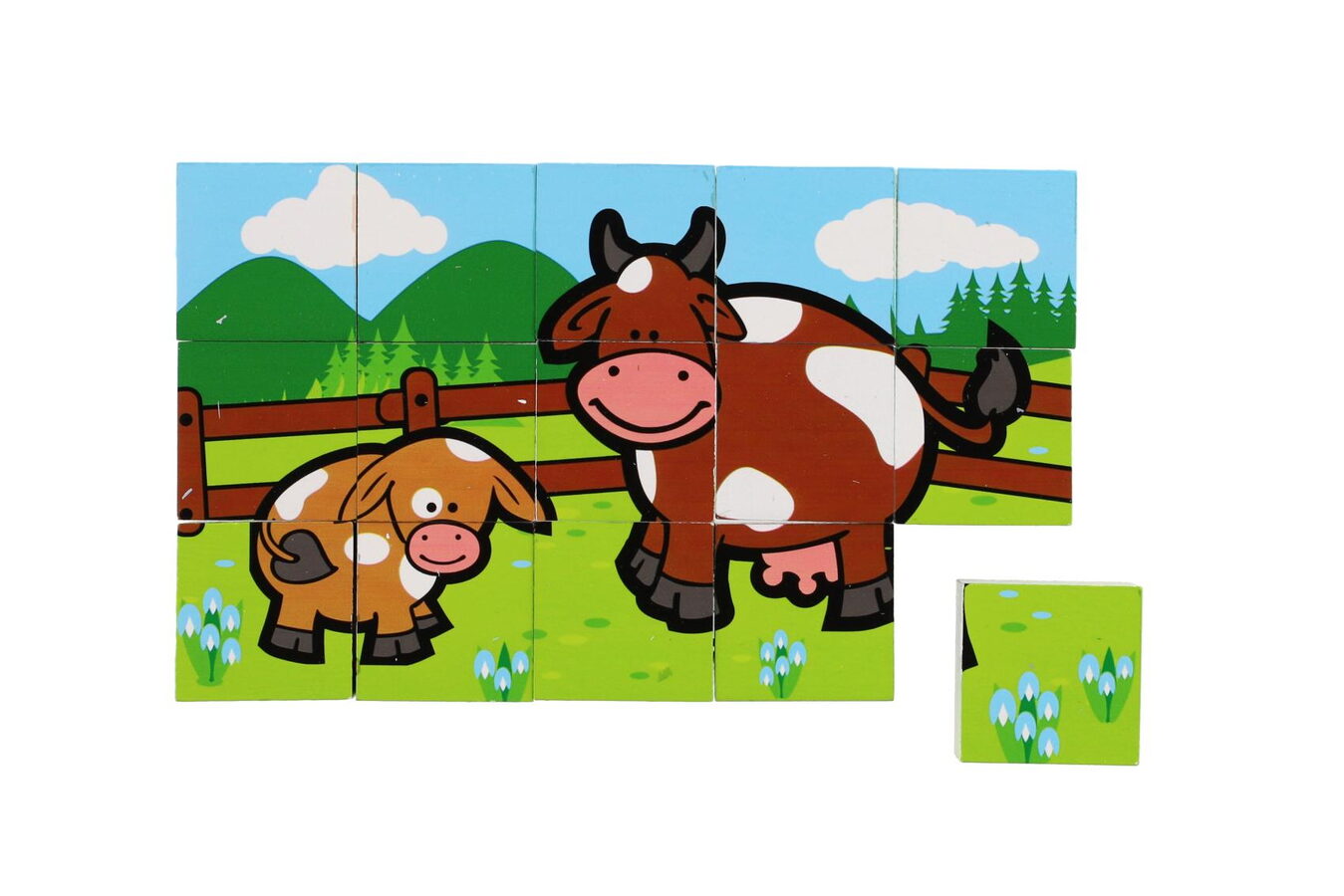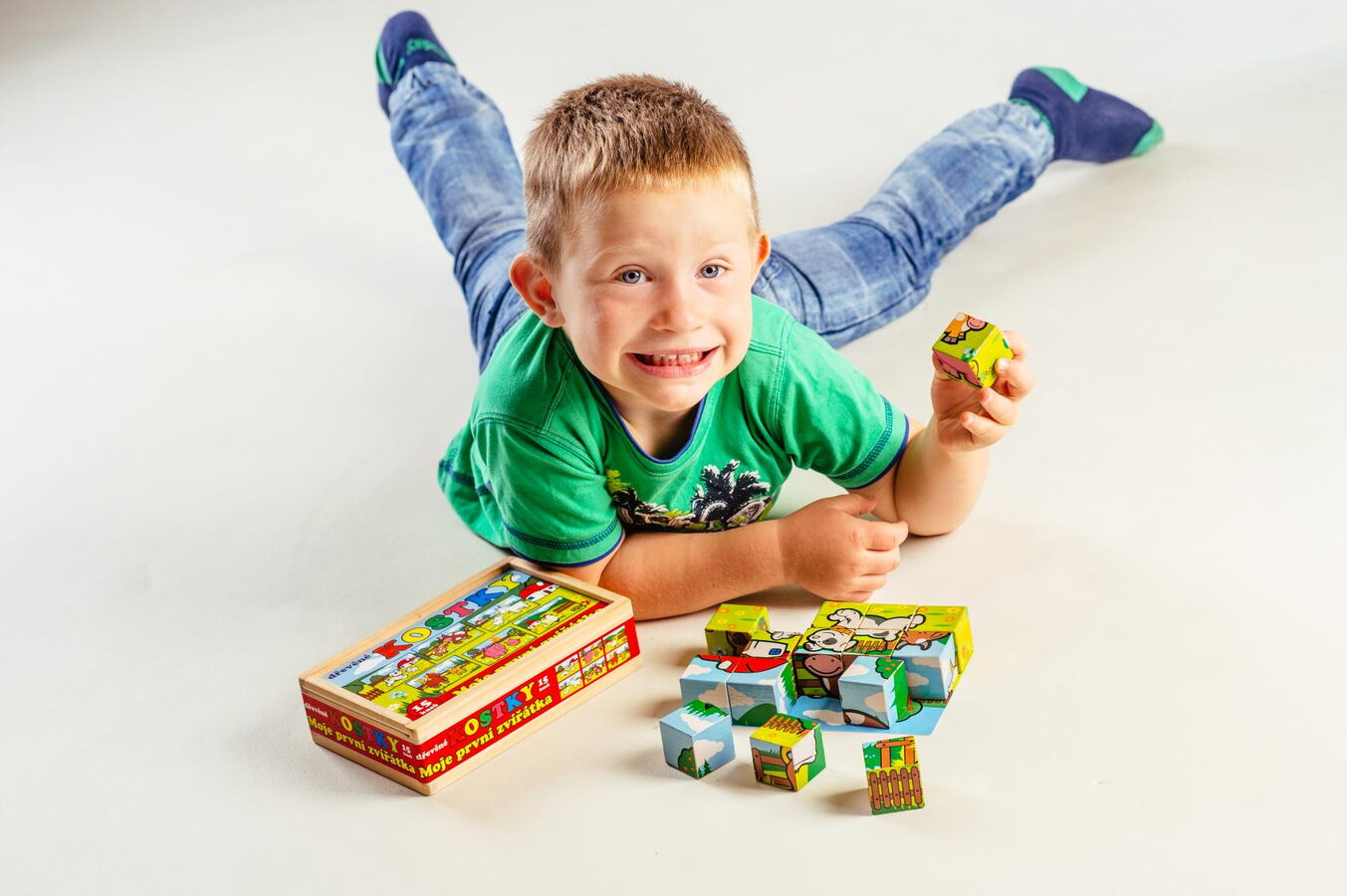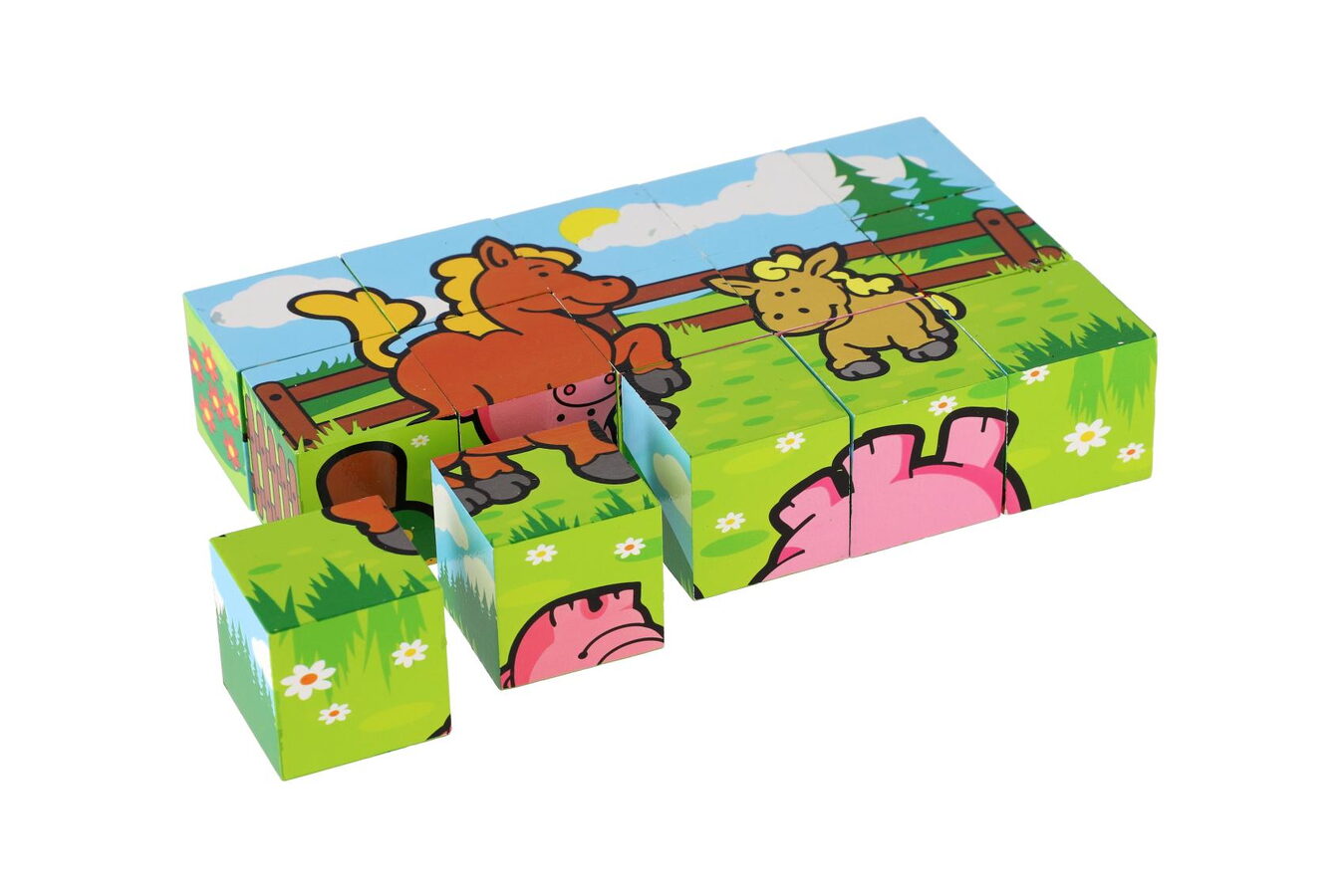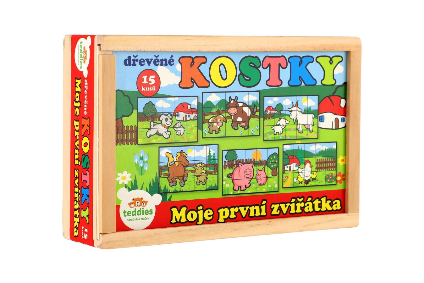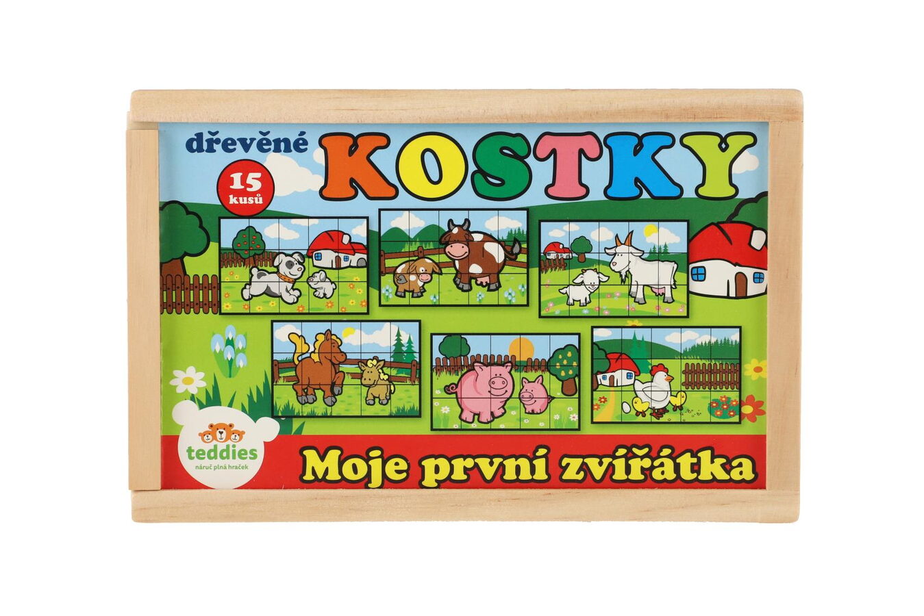Kostky dřevěné Moje první zvířátkas mláďaty 15 kusů v krabičce. Dřevěné kostky s motivem domácích zvířátek rozvíjí jemnou motoriku dítěte. Poskládej si pejska se štěňátkem, slepičku s kuřaty, prasátko se selátkem, kravičku s telátkem, koníka s hříbátkem nebo kozičku s kůzletem.