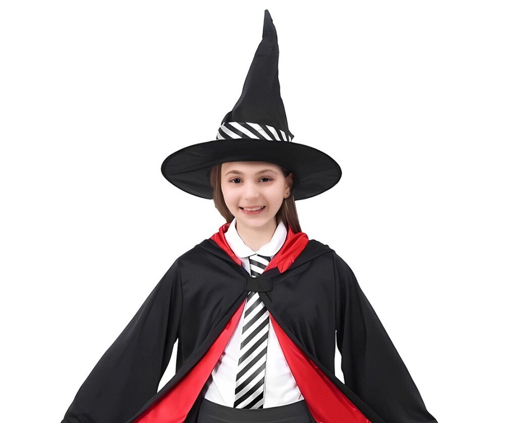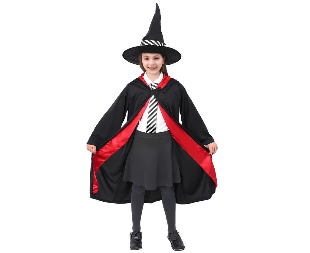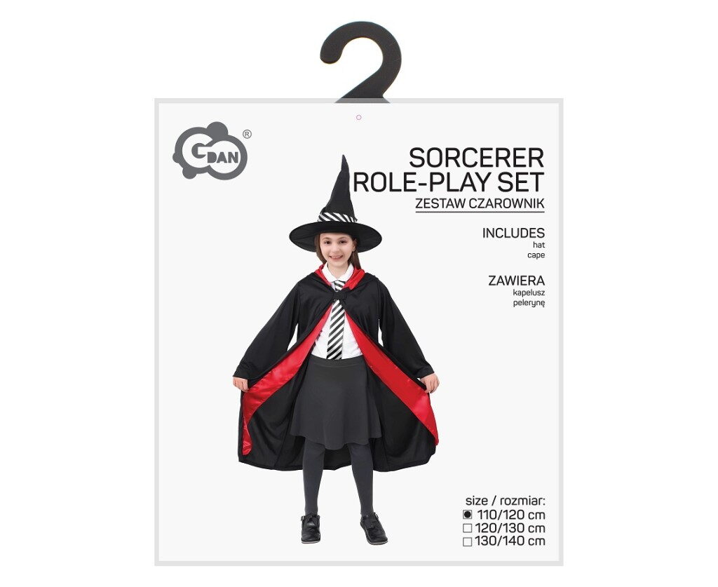 Dětský kostým Kouzelník/Kouzelnice, velikost 110/120 cm. Kostým obsahuje kouzelnický klobouk a kouzelnický plášť.