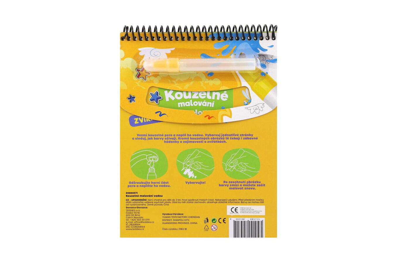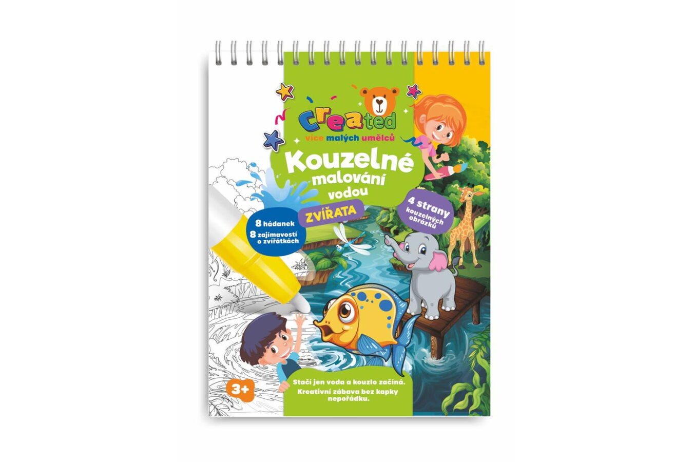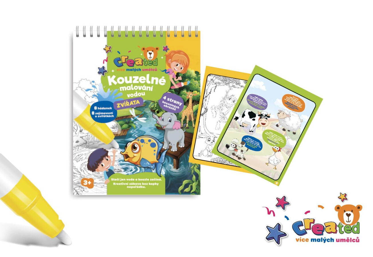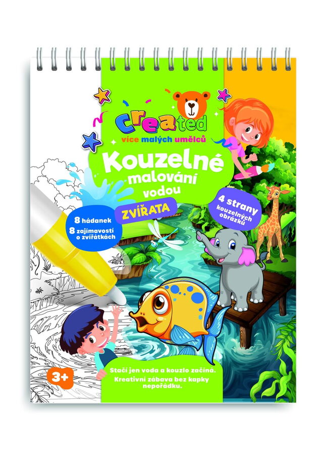 Objevte kouzelný svět malování bez nepořádku! Tento kreativní blok s motivem zvířat přináší dětem hodiny zábavy, rozvoje fantazie a poznávání přírody. Stačí naplnit kouzelnou tužku vodou a obrázky začnou ožívat barvami – jako mávnutím kouzelného proutku! Po vyschnutí obrázek opět zmizí a lze ho malovat znovu a znovu. Obsahuje 4 kouzelné obrázky k vybarvování vodou, 8 hádánek a zajímavostí o zvířatech a 1 kouzelnou vodní tužku.