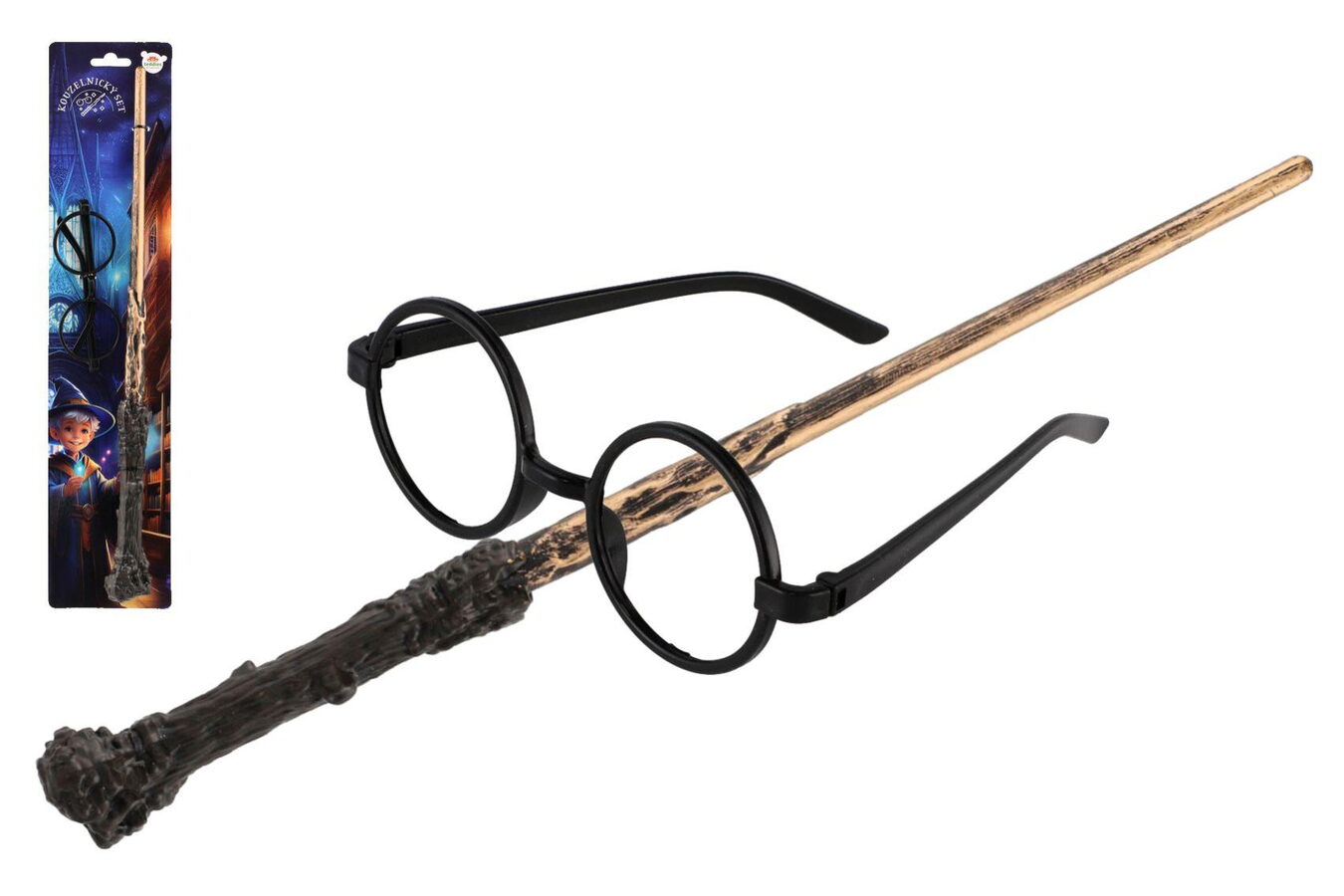 Staňte se mistrem kouzel. Tento kouzelnický set přenese děti do světa fantazie, čar a zaklínadel. Stylová hůlka a typické kulaté brýle jsou nezbytnou výbavou každého malého kouzelníka – ať už se chystá na čarodějnický trénink, kouzelnický souboj nebo kouzla jen tak pro zábavu.
