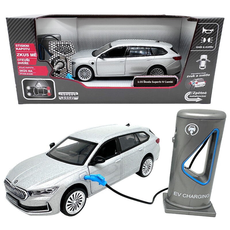 Kovový model - 1:35 Škoda Superb IV Combi Stříbrně šedá + nabíjecí stanice