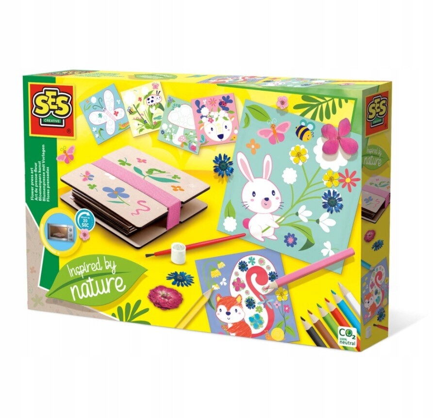 Tato kreativní sada vám umožní přenést krásu přírody přímo do vašich uměleckých děl! Její hlavní předností je speciální lis na květiny, který lze použít v mikrovlnné troubě. Díky tomu usušíte nasbírané květiny a listy během pouhých 20 vteřin, namísto čekání dlouhé týdny. Sada obsahuje: Lis na květiny: Speciální dřevěný lis, bezpečný pro použití v mikrovlnné troubě.Karty k dobarvení: 6 předtištěných karet, na které se sušené květiny lepí.Barvičky/Pastelky: 8 barevných tužek/pastelek pro dobarvení podkladových karet.Lepidlo: K přilepení usušených květin na obrázky.Štětec: K nanášení lepidla.