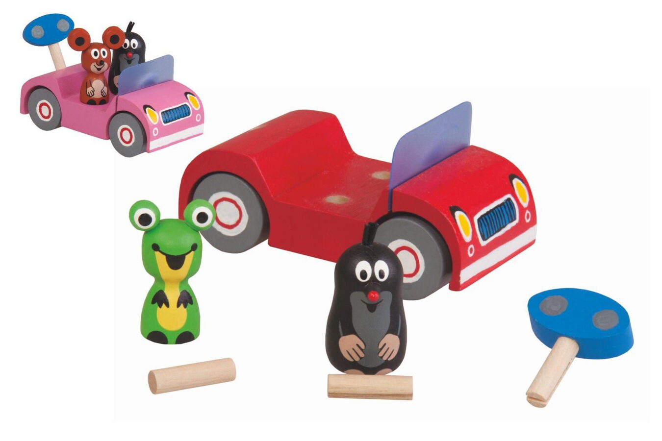Krteček s kamarádkou Žabkou se vydali na výlet v červeném autíčku.