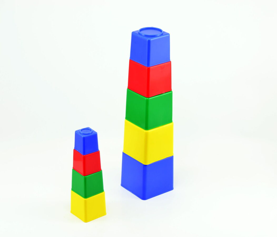 Směr Kubus pyramida skládanka hranatá plast asst 4 barvy 9ks v sáčku 9x9x9cm 12m+