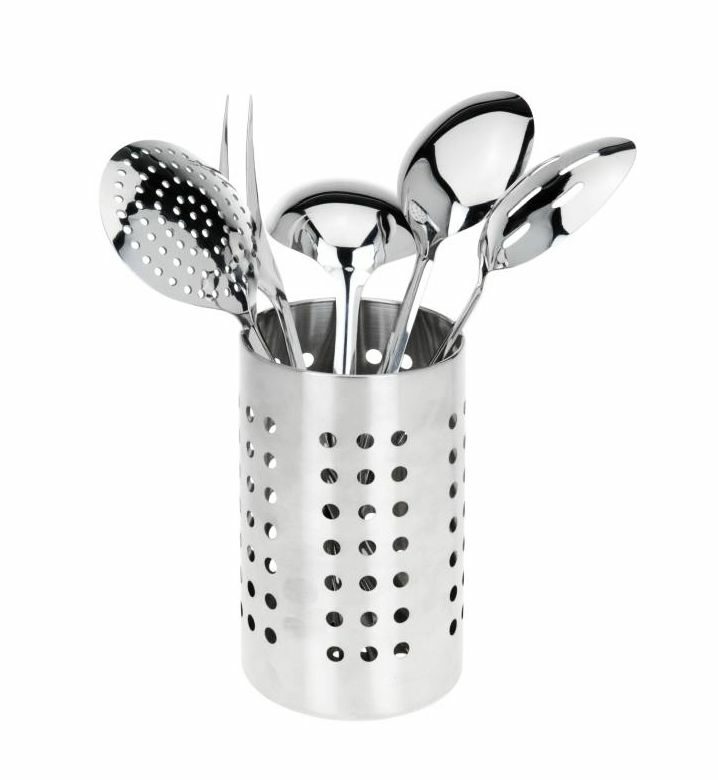 - praktická sada kuchyňského vybavení ve stojanu- nejčastěji používané kuchyňské pomůcky při vaření, máte přehledně v jednom stojanu vždy po ruce- materiál kuchyňského náčiní: nerezová ocel- sada 6 ks obsahuje:- vidlička 32 cm- lžíce 33 cm- děrované lžíce 33 cm- naběračka 28,5 cm- pěnovačka 32 cm- držák na náčiní pr. 10,5 x 18 cm- držák lze použít také jako odkapávač