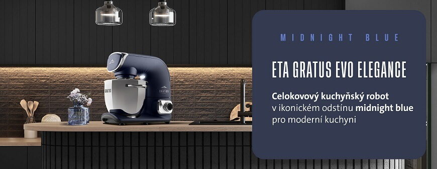Objevte stylovou řadu kuchyňských robotů ETA Gratus EVO Elegance v zajímavých barevných kombinacích. Tento kuchyňský robot vás tedy oslní nejen svou funkčností a celokovovým provedením, ale i elegantní barvou půlnoční modré, která dodá vaší kuchyni moderní šmrnc a špetku luxusu.