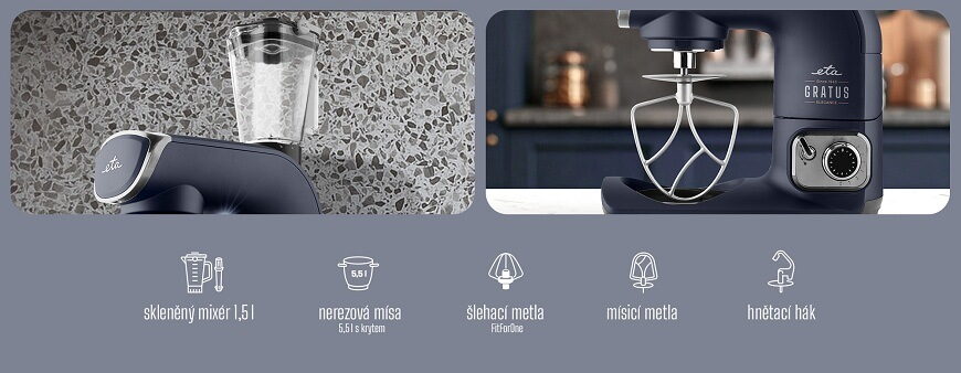 ETA Gratus EVO Elegance je spolehlivý kuchyňský robot v nadčasovém designu, s výkonným motorem a celokovovým provedením, které vydrží roky. Jeho příslušenství v balení vám usnadní každé pečení nebo přípravu zdravých smoothie. Pokud chcete jeho funkce rozšířit o nové možnosti, omrkněte nabídku příslušenství, které si můžete dokoupit: