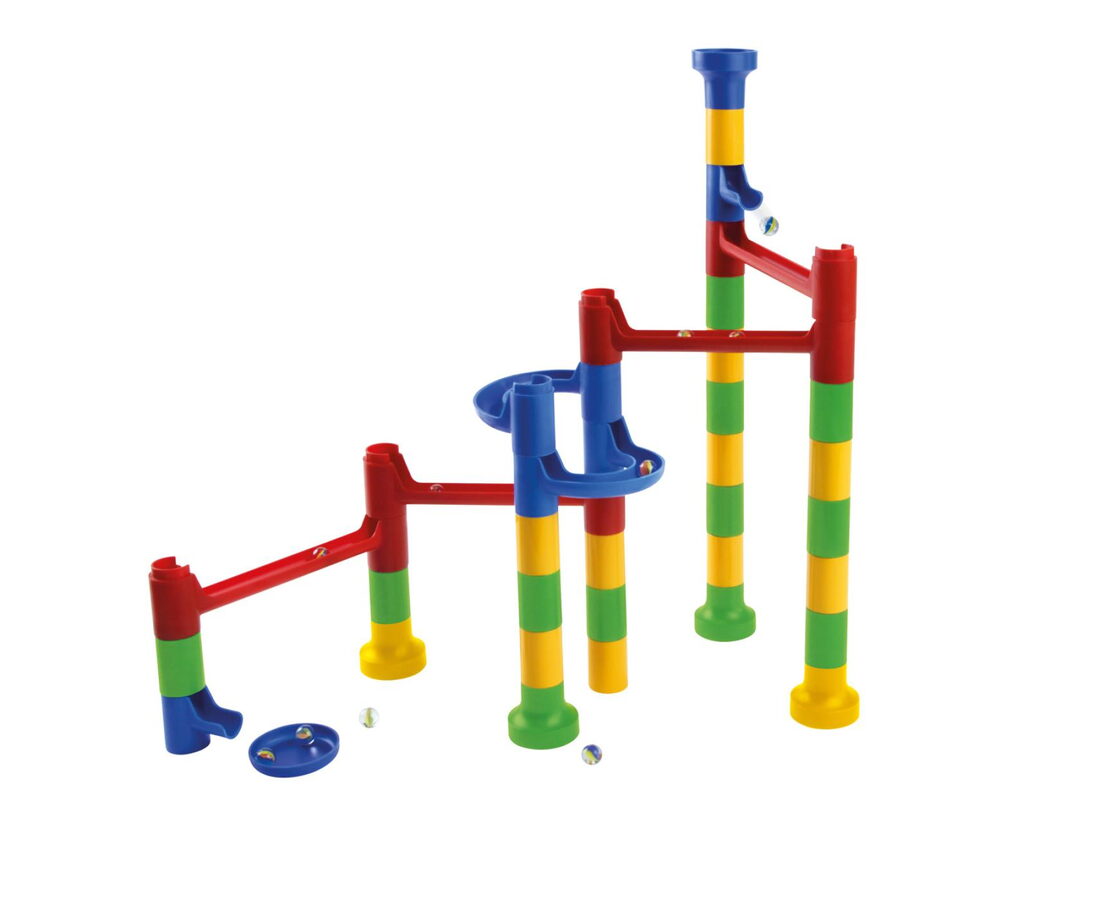 Kuličková dráha umožňuje sledovat cestu kuličky a její rychlost z horní části až dolů. Která kulička bude rychlejší a které sestavení dráhy bude zajímavější? Barevná kuličková dráha obsahuje spoustu překážek, které zvyšují napětí, zda kulička správně proběhne celou stavebnicí. Sestavit dráhu může dítě mnoha způsoby, dle vlastní fantazie. Stavebnice slouží k procvičení jemné motoriky a donutí dítě přemýšlet. Balení obsahuje 34 ks + 10 kuliček, v krabici.