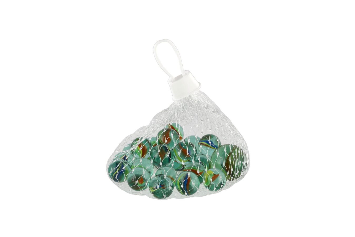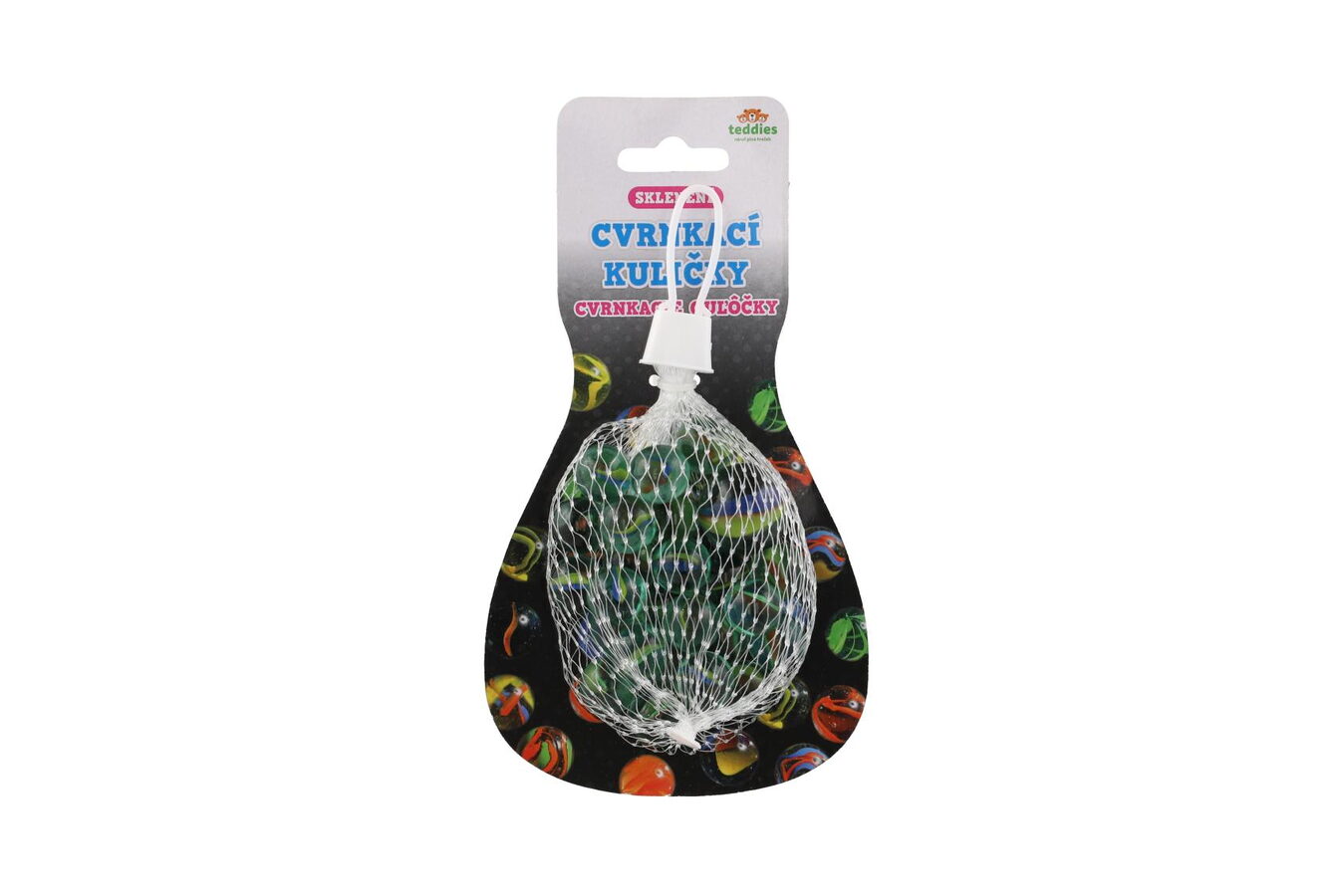 Kuličky cvrnkací skleněné různé velikosti v síťce na kartě 10,5x19cm