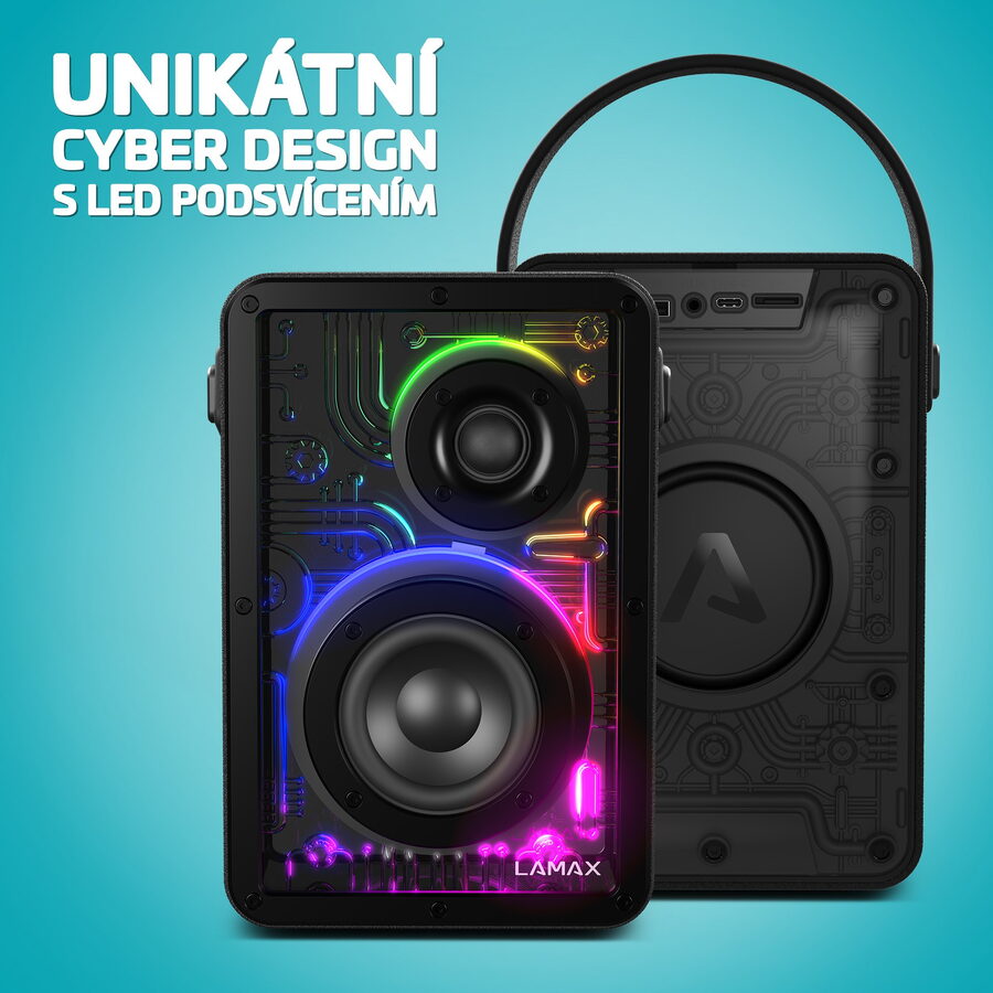 Naskoč na vlnu pořádný zábavyRozjeď party, na kterou jen tak nikdo nezapomene nebo si užívej poslech muziky i podcastů, jako kdyby byl interpret s tebou v místnosti. Jde to snadno, na scénu totiž přichází LAMAX CyberWave1, party reproduktor se 4 nastavitelnými Cyber LED efekty, který všechny naprosto uchvátí. Jeho tělo s dvoupásmovými reproduktory duní výkonem až 50 W a BeatBass® technologie tě úplně pohltí, tak parádní zvuk poskytuje. Reprák podporuje širokou škálu formátů i připojení, parádně až na 15 metrů funguje jeho moderní Bluetooth 5.3, který ho automaticky spáruje s různými zařízeními. Party se často protáhnou, ale to nevadí, protože baterie repráku vydrží až 20 hodin, pak ho jen stačí dobít přes USB-C a jede se dál. Tenhle reprák je velký fešák vyvedený v mobilním Cyber designu s madlem pro snadné přenášení. Jednoduchý a intuitivní je i jeho ovládání. Užívej si večírky klidně i venku nebo u bazénu, nějaká voda repráku neublíží. Je voděodolný s ochranou IPX5.