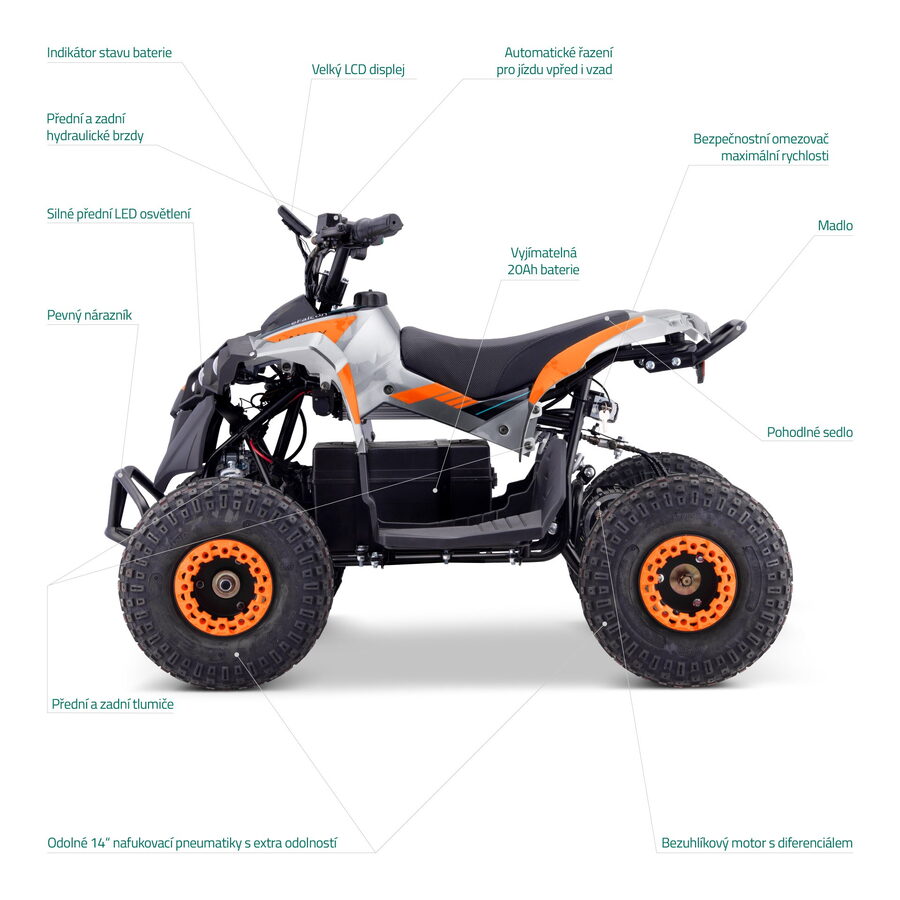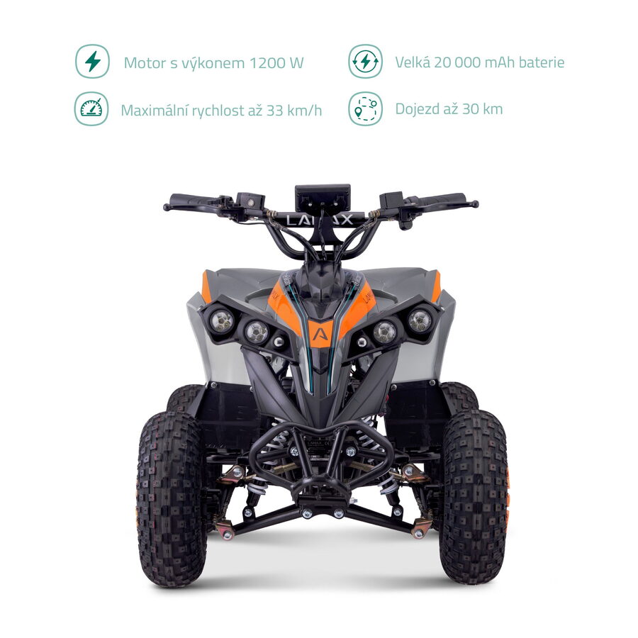 Dospělácká čtyřkolka pro potomkySe super silným 1200W motorem elektrické čtyřkolky LAMAX eFalcon končí veškerá legrace. Začíná totiž opravdická jízda. Maximálka 33 km/h, dojezd 30 km = dvě a půl hodiny zábavy, diferenciál, hydraulické kotoučovky a automatická převodovka dělají z tohohle ekologickýho dětskýho vozítka nezdolnou mašinu, pro kterou je jakákoli překážka v ostrým terénu easy. S dvojicí silných světel se dá jezdit klidně i po setmění.
