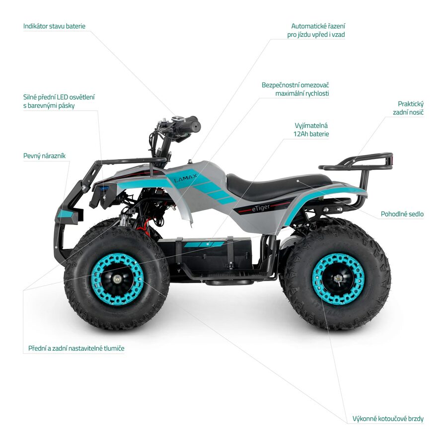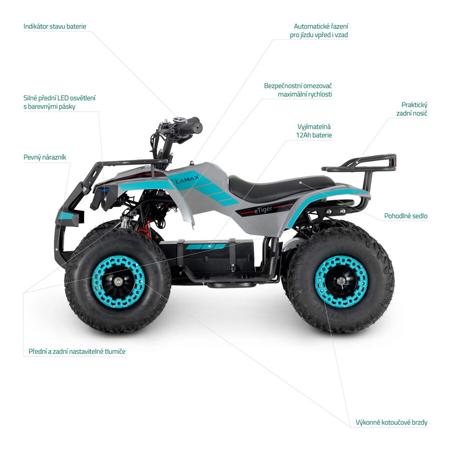 Konečně důvod vypnout komp a vyrazit venTahle elektrická čtyřkolka vyláká i toho nejzatvrzelejšího odmítače outdoorových aktivit na čerstvý vzduch. S dojezdem až 20 kiláků, maximálkou 25 km/h, parádní stabilitou a výkonem 1000 W si váš potomek užije i jízdu terénem do kopce. Ve sjezdu ho podrží přední i zadní kotoučová brzda. Tichý a ekologický elektromotor nebude rušit ani tu nejpřísnější sousedku a parádní design v čele se stylovými LEDkami ukáže, kdo je pánem ulice. Navíc, již nemusíte trávit hodiny složitým montováním. Jedině od nás dostanete čtyřkolku již složenou, seřízenou, otestovanou a připravenou pro vaši jízdu.