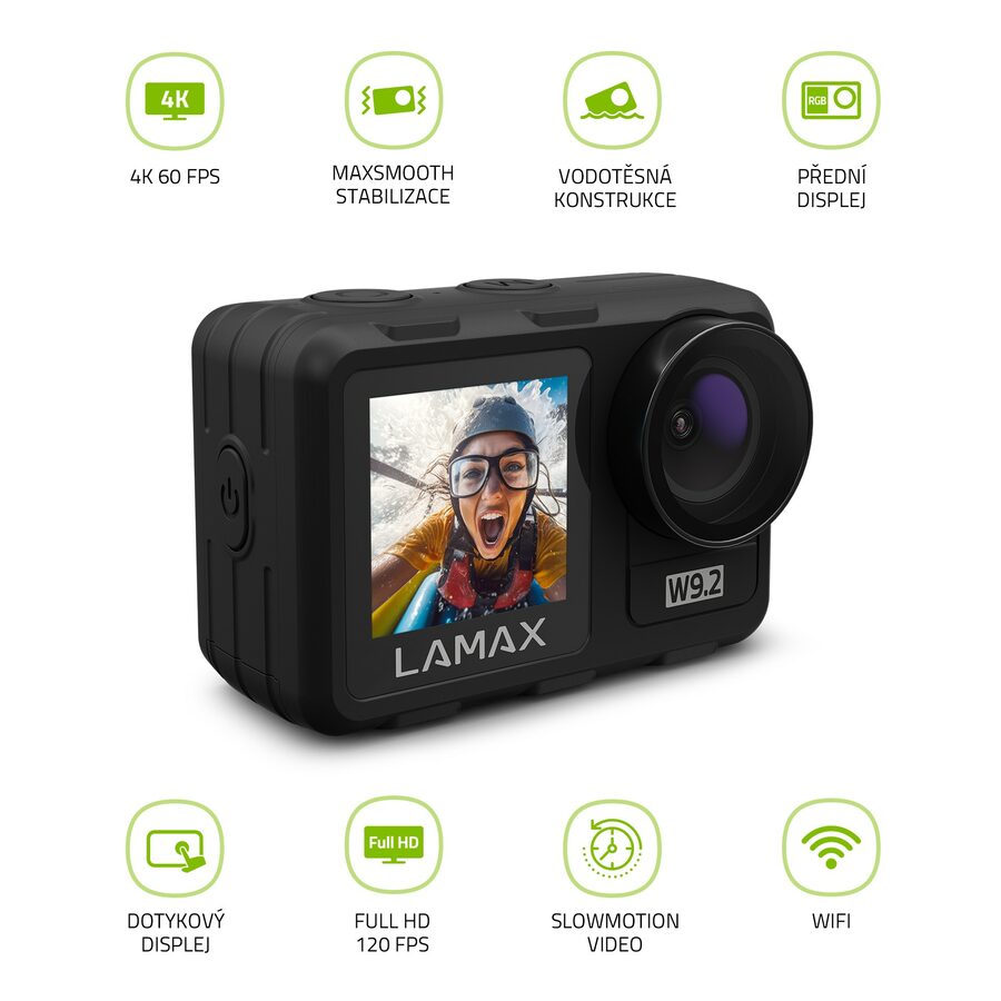 Dokonalost v každém záběruKaždý adrenalinový dobrodružství nebo zážitky z rodinný dovči zachyť v top kvalitě, kterou ti dá LAMAX W9.2. Akční kamerka uchová tvoje řádění na vodě, v horách nebo třeba ve skateparku ve 4K při 30 fps a i když to bude hodně házet, elektronická stabilizace MAXsmooth obraz vyhladí k dokonalosti. Přes hlavní 2“ displej ovládáš vše dotykově a 1,4“ přední displej je super pro selfie záběry, kdy ti pomůže vyladit kompozici. Kamera není žádný ořezávátko, do 12 metrů je vodotěsná a s pouzdrem se s tebou potopí klidně do 40 metrů. Prostě rozbal její bohatou výbavičku, hraj si s kreativními režimy, Slowmotion funkcí, dálkovým ovladačem a dalšími vychytávkami, ať se můžeš pochlubit profi záběry.