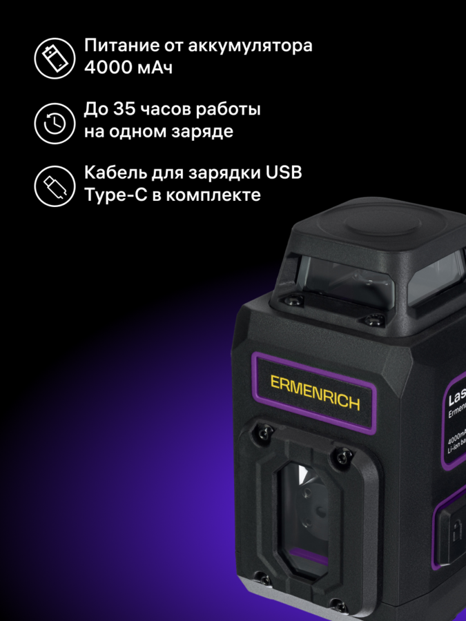 Laserový nivelační přístroj Ermenrich PRO LV20 vytváří značení ze 6 čar. Ve vodorovném směru vytváří jednu rovinu s rozptylem 360° a ve svislém směru dvě čáry. Laserový paprsek je zelený, dobře viditelný při jakékoliv úrovni osvětlení. Jas čar lze zvolit ručně ze 4 úrovní. Změna úrovně jasu vám pomůže přizpůsobit viditelnost čar podle světelných podmínek. Reguluje také provozní dobu přístroje: při maximálním jasu bude nivelační přístroj fungovat 6 hodin a při minimálním jasu 35 hodin.