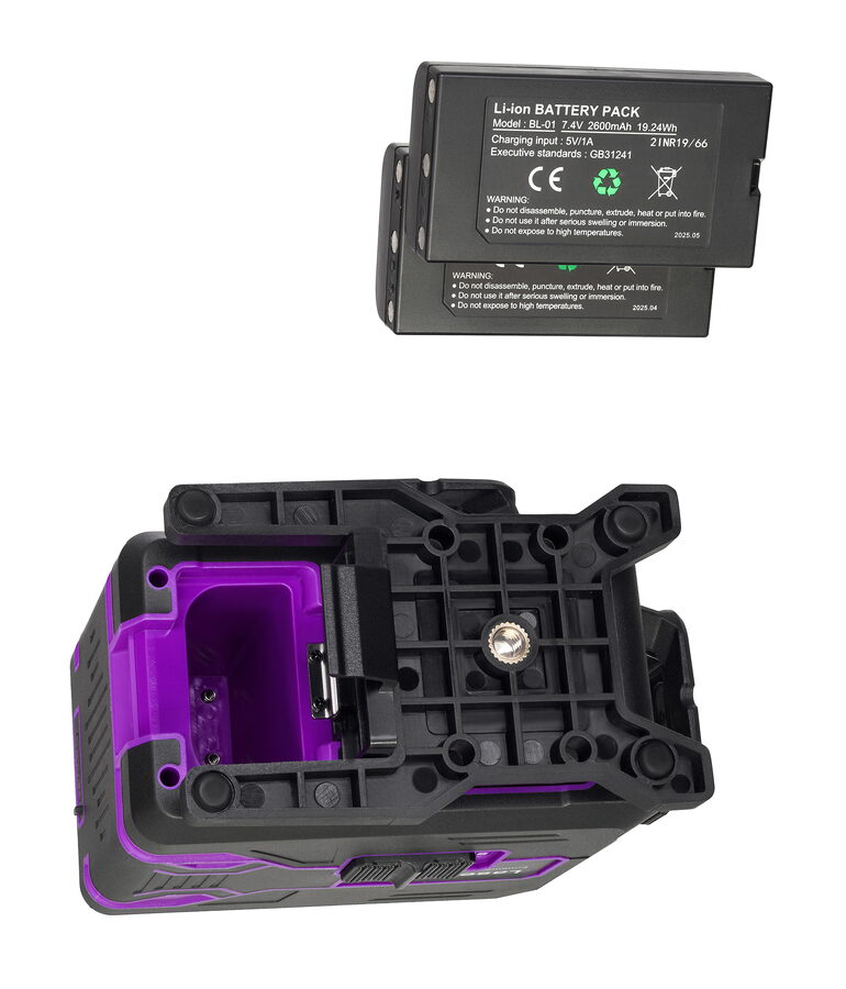 Přístroj Ermenrich PRO LV70 je napájen vyměnitelnou lithium-iontovou baterií s kapacitou 2600 mA h, která se nabíjí ze síťového zdroje pomocí kabelu USB typu C (součást dodávky) a standardního síťového adaptéru (doporučuje se použít adaptér 5 V/2 A). Dálkové ovládání je napájeno baterií CR2032. Vezměte prosím na vědomí, že tento laserový nivelační přístroj má pouze malý stupeň ochrany proti prachu a vlhkosti. Aby nedošlo k poškození přístroje, chraňte jej před přímým působením vlivů okolního prostředí.