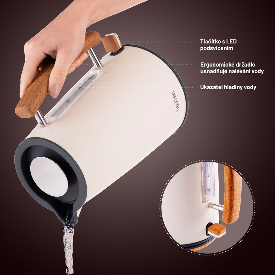 I mezi rychlovarnými konvicemi lze najít tu, která dodá vaší kuchyni punc stylu a originality. Konvice Lauben je navržena v minimalistickém a vkusném severském designu, který se bude ve vaší kuchyni vyjímat. Tělo konvice je vyrobeno z #304 nerezové oceli. Pogumovaný povrch konvice v kombinaci s rukojetí v dřevěném dekoru vypadá na lince stylově. Hlavní vypínač konvice disponuje LED podsvícením.