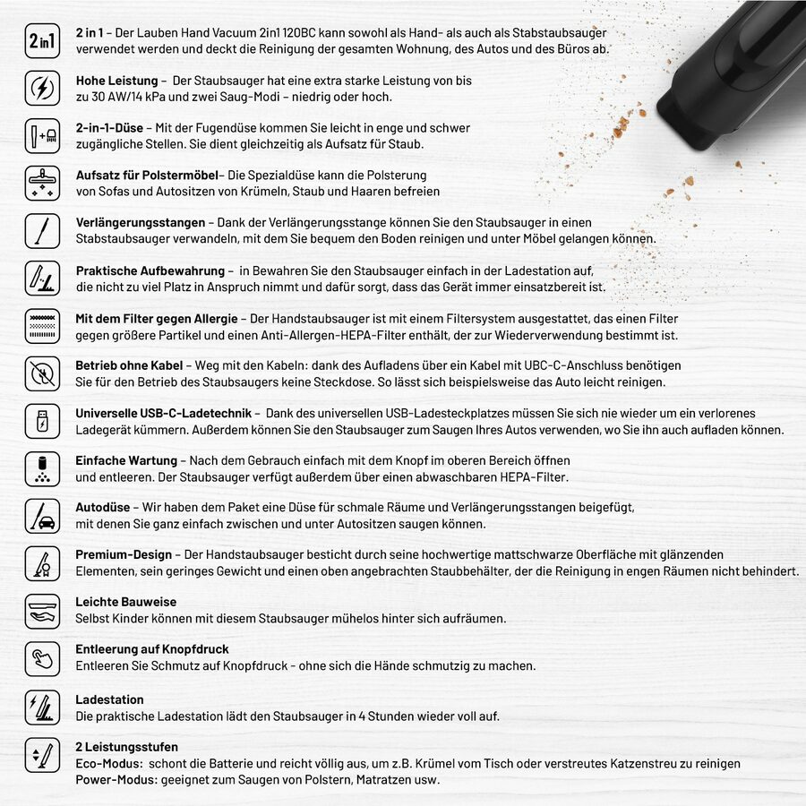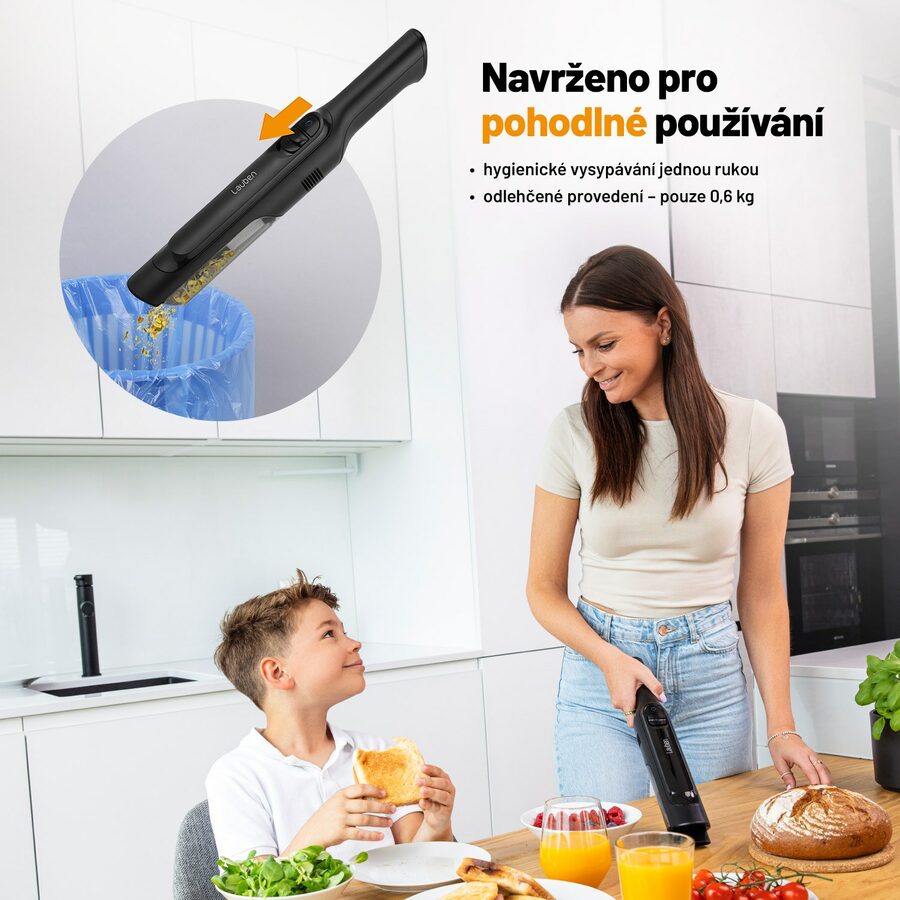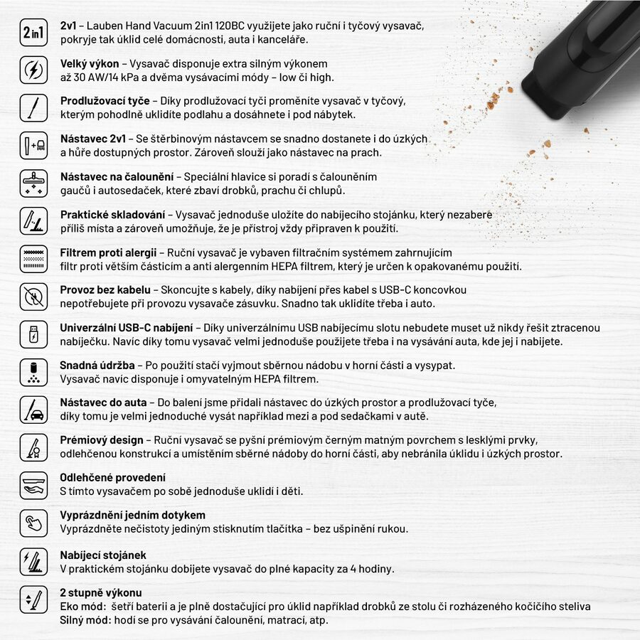 Silný a flexibilní pomocník, který vysaje každé zákoutíVytahovat kvůli každému smítku velký vysavač, s námahou ho přemisťovat po bytě a přeskakovat kabel už od teď nemusíte. Ruční vysavač Lauben Hand Vacuum 2in1 120BC je stále po ruce a v mžiku vás zbaví drobků, zvířecích chlupů a dalších nečistot doma, v autě i v kanceláři. Po připojení prodlužovací tyče pohodlně vysajete také podlahu, a to bez hledání zásuvky. Vysavač je totiž dobíjecí. Odlehčené provedení umožňuje, aby jeho ovládání zvládly i děti, zároveň však disponuje silným výkonem až 30 AW/14 kPa. Nečistoty zachycují omyvatelné filtry, není tedy nutné je měnit. Ani další údržba není složitá, stačí uvolnit sběrnou nádobu v horní části a vysypat – rychlé a hygienické. Vysavač dále disponuje skladovacím nabíjecím stojánkem s USB-C, dvěma vysávacími módy či nástavci na čalounění a 2v1.