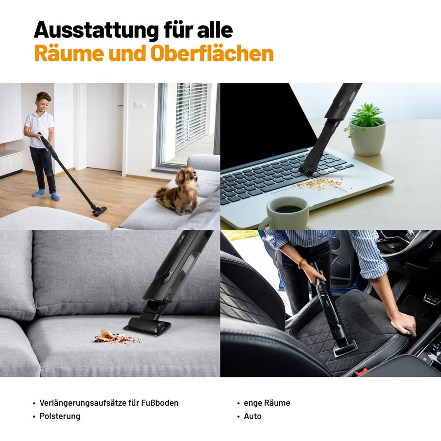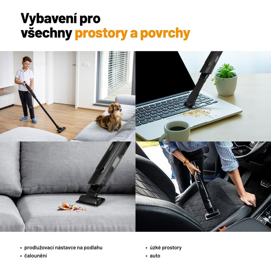 Lauben Hand Vacuum 2in1 120BC využijete jako ruční vysavač pro rychlý úklid nebo pro vysátí podlahy po přidání prodlužovací tyče. Kabely nikde nepřekážejí, přístroj stačí dobít prostřednictvím kabelu s USB-C koncovkou. Sběrná nádoba umístěná v horní části u držadla umožňuje vysávání i pod nábytkem či na jiných hůře dostupných místech, jejichž údržbě pomůže také štěrbinový nástavec 2v1. Sedačky doma a v autě zase pohodlně uklidíte díky nástavci na čalounění.