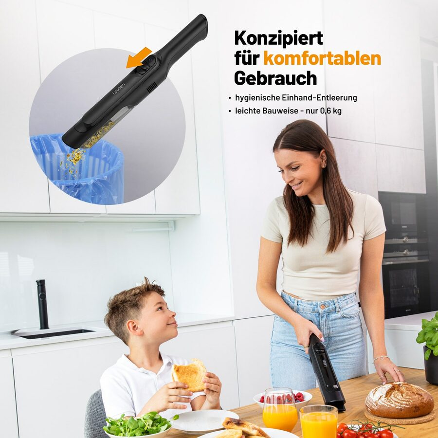 Ruční vysavač v prémiovém designu s černým matným povrchem a lesklými prvky je vybaven praktickým nabíjecím stojánkem s USB-C nabíječkou, je tedy stále připraven k použití a nezabere příliš místa. Díky omyvatelným filtrům šetří vaši peněženku, neboť není potřeba jejich neustálá obměna. Velmi snadno a hygienicky lze rovněž udržovat sběrnou nádobu umístěnou v horní části u držadla, tu stačí jen vyjmout a vysypat.