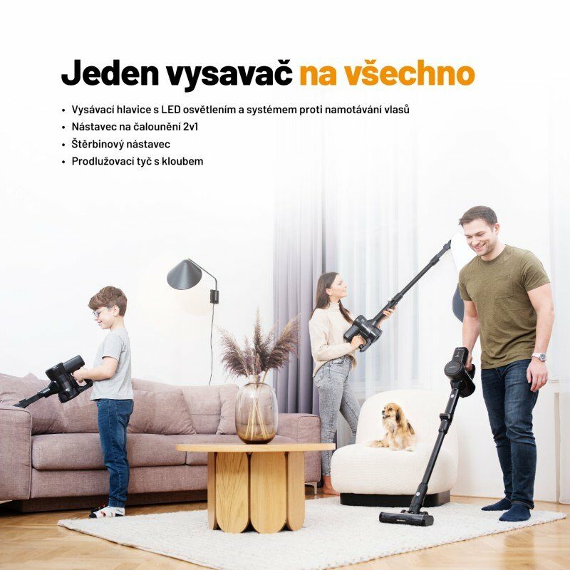 Univerzální motorizovaný kartáč se hodí pro všechny druhy podlah včetně těch, na nichž se pohybují domácí mazlíčci. Nejen jejich chlupy bezpečně odstraní hlavice se systémem proti namotávání vlasů. Úklid usnadňuje flexibilní tyč s kloubem a sběrná nádoba umístěná v horní části, vysavač tak jednoduše zajede i pod nábytek a do užších prostor. Díky provedení bez kabelu a možnosti úpravy na ruční vysavač lze přístroj využít kdekoliv, například při čištění auta. Vydrží až 35 minut na jedno nabití.