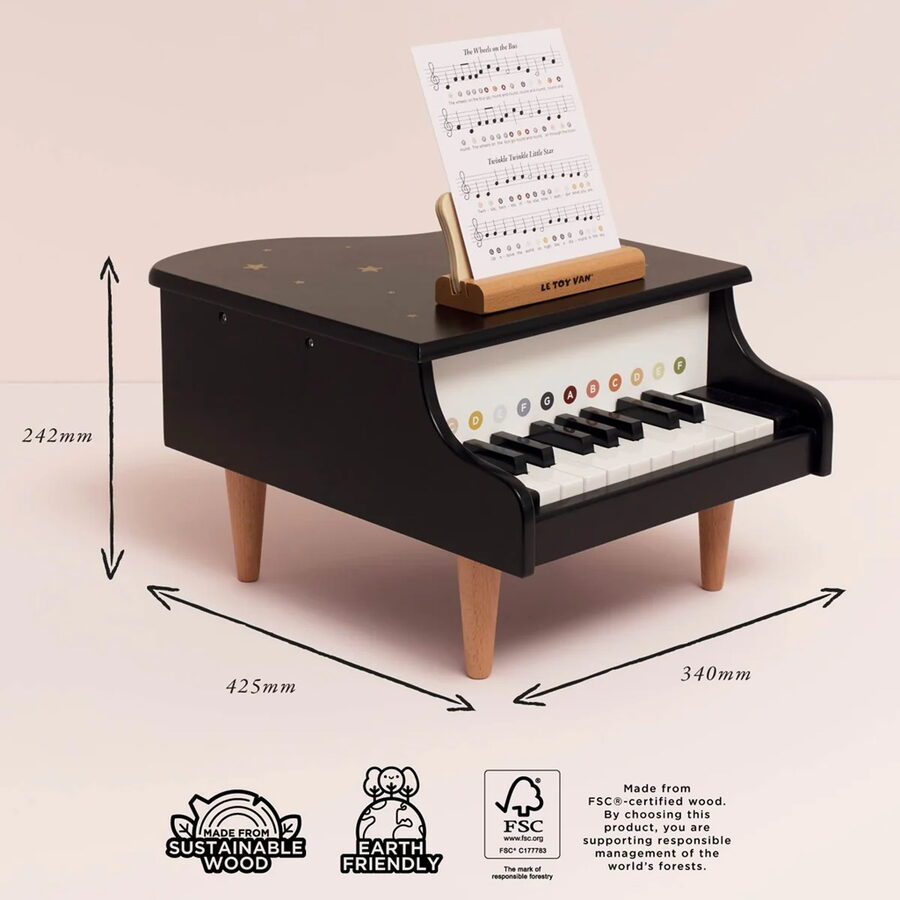 Probuďte v dětech lásku k hudbě s tímto krásně zpracovaným dřevěným klavírem z certifikovaného FSC® dřeva, navrženým speciálně pro začínající hudebníky. Tento okouzlující nástroj, vyrobený z udržitelného materiálu a opatřený elegantním černým lakem s jemnými zlatými hvězdami, vnáší do hry styl i prostor pro tvořivost. Robustní dřevěné nožky zajišťují stabilitu a odolnost, díky čemuž je klavír připraven na dlouhé hodiny hraní. Součástí balení jsou dva oboustranné notové zápisy s osmi oblíbenými dětskými říkankami v angličtině, které pomáhají rozvíjet základní hudební dovednosti hravou formou. Dřevěný stojánek bezpečně udrží noty na místě, což usnadňuje hru i těm nejmenším prstíkům. Tento nadčasový kousek je nejen krásnou hračkou, ale i hodnotnou vzpomínkou, která může dětem připomínat první krůčky do světa hudby po mnoho let. Vydává krásné zvuky a rozvíjí vztah k hudbě, ale není to profesionální hudební nástroj. Hračka není dokonale naladěná, slouží především k zábavě. Hračky s účelemVšechny hračky firmy Le Toy Van jsou vyrobeny s cílem – aby dlouho vydržely. Designovány s láskou zkušenými řemeslníky za použití etických praktik a udržitelných materiálů, které jsou laskavější k naší planetě. Hlavní vlastnosti: vyrobeno eticky z udržitelného dřevatestováno dle nejpřísnějších standardůmalováno netoxickými barvami na bázi vodyrozvíjí talent dětí, cit pro rytmus a melodii