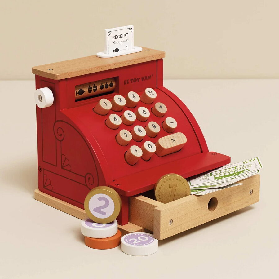 Tahle roztomilá dřevěná pokladna v retro stylu vypadá naprosto úžasně a je ideální hračkou pro malé prodavače i prodavačky. Díky ní se děti zábavnou formou naučí počítat, poznávat čísla a rozvíjet své sociální dovednosti při hře na obchod. Pokladna má spoustu detailů. Otevírací šuplík na peníze, dřevěnou účtenku, papírové bankovky a mince i platební kartu. Její vintage design s jasně červenou barvou a zlatými detaily dodává hračce jedinečný šmrnc a zapadne do každého dětského pokojíčku.Tato odolná vzdělávací hračka je vyrobena z kvalitního, udržitelně získaného dřeva a díky preciznímu zpracování vydrží celé roky hraní. Hračky s účelemVšechny hračky firmy Le Toy Van jsou vyrobeny s cílem – aby dlouho vydržely. Designovány s láskou zkušenými řemeslníky za použití etických praktik a udržitelných materiálů, které jsou laskavější k naší planetě. Hlavní vlastnosti: rozvíjí matematické schopnosti a představivost dětívyrobeno eticky z udržitelného dřevatestováno dle nejpřísnějších standardůmalováno netoxickými barvami na bázi vodyinspiruje k představivé hřerozvíjí kognitivní dovednostivhodné pro děti od 3 let