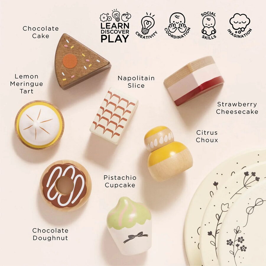 Přineste dětským hrám sladkou atmosféru a nekonečnou kreativní zábavu s tímto dokonalým doplňkem do dětské kuchyňky či herního koutku. Skvělá hračka pro malé cukráře i hospodyňky. Tento kvalitní stojan na dorty je ručně vyroben ze dřeva z udržitelných zdrojů, ekologicky lakován netoxickými vodovými barvami a plně bezpečný pro děti. Každé z tří pater je krásně zdobeno. Stojan je navržen tak, aby dokonale ladil s dalšími dřevěnými hračkami a doplňky.Součástí setu je 7 detailně zpracovaných dřevěných sladkostí. Hra s touto sadou sladkostí podporuje rozvoj fantazie, představivosti, jemné motoriky a sociální hry. Děti si mohou samy servírovat, krájet, nabídnout svým panenkám či kamarádům sladké pohoštění. Celý set je plast-free, šetrný k přírodě a navržen s myšlenkou dlouhodobé trvanlivosti, takže vydrží i opakované hraní.Ideální jako dárek pro děti od 3 let, ať už chcete doplnit dětskou kuchyňku, rozšířit sadu hraček nebo jen podpořit kreativitu a hraní formou role-play. Tento dřevěný stojan na dorty se snadno stane oblíbenou částí dětského herního světa. Hlavní vlastnosti: dřevěný stojan se třemi patry elegantní design 7 dřevěných dezertůvyroben z FSC® certifikovaného dřeva a netoxických vodových barev ekologický, bezpečný a vhodný pro dětipodporuje kreativitu, fantazii a jemnou motorikuskvělá pomůcka pro rozvoj sociálních dovedností a představivosti - děti si nacvičí sdílení, pohostinnost a scénáře z běžného života Značka a certifikát FSC® (Forest Stewardship Council) zaručuje, že dřevo, ze kterého byl produkt vyroben, nebylo vytěženo nelegálně a pochází z lesů obhospodařovaných šetrným či přírodě blízkým způsobem, ve kterém jsou dodržovány přísné environmentální a sociální požadavky. Značka FSC® na výrobku znamená, že svým nákupem pomáháte chránit lesy a podporujete šetrné, odpovědné či přírodě blízké hospodaření, díky kterému jsou naše lesy stabilnější, zdravější, mají přirozenou druhovou skladbu a lépe odolávají negativním následkům klimatických změn.