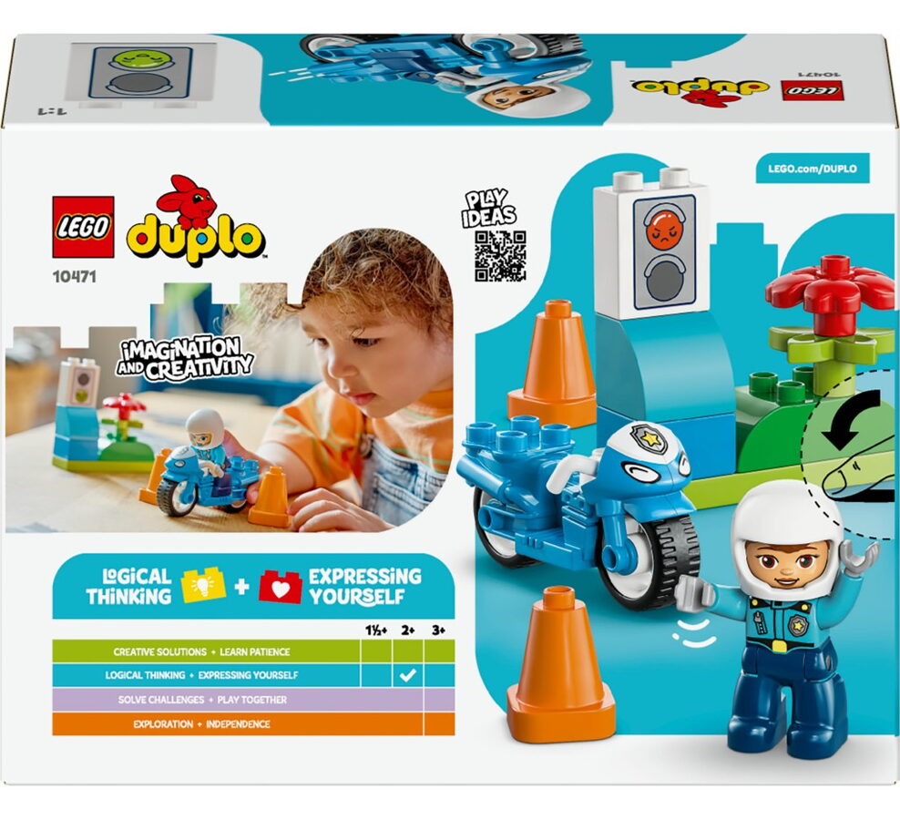 Dopřejte dětem od 2 let bleskovou zábavu se stavebnicí LEGO® DUPLO® Město Modrá policejní motorka (10471). S touto vzdělávací hračkou si malé děti budou hrát na to, že pomáhají v komunitě, a vyrazí s policistkou na hlídku na silnicích na parádní motorce LEGO DUPLO. Tato stavebnice představuje skvělý dárek k narozeninám nebo jen tak pro radost pro děti od 2 let, které milují modely vozidel. Dáreček pro malé děti obsahuje figurku policistky, kostku v podobě semaforu a kužely. Stavebnice LEGO DUPLO s velkými barevnými kostkami, zábavnými příběhy a rozmanitými postavami jsou navrženy tak, aby podněcovaly přirozenou zvědavost batolat a pomáhaly jim procházet důležitými vývojovými milníky. Děti posadí policistku LEGO DUPLO na motorku a procvičí své jemné motorické schopnosti při jízdě kolem kuželů. S hračkou v podobě semaforu můžou rodiče naučit malé účastníky silničního provozu, že červená znamená zastavit a zelená znamená start! Stavebnice obsahuje 11 dílků.