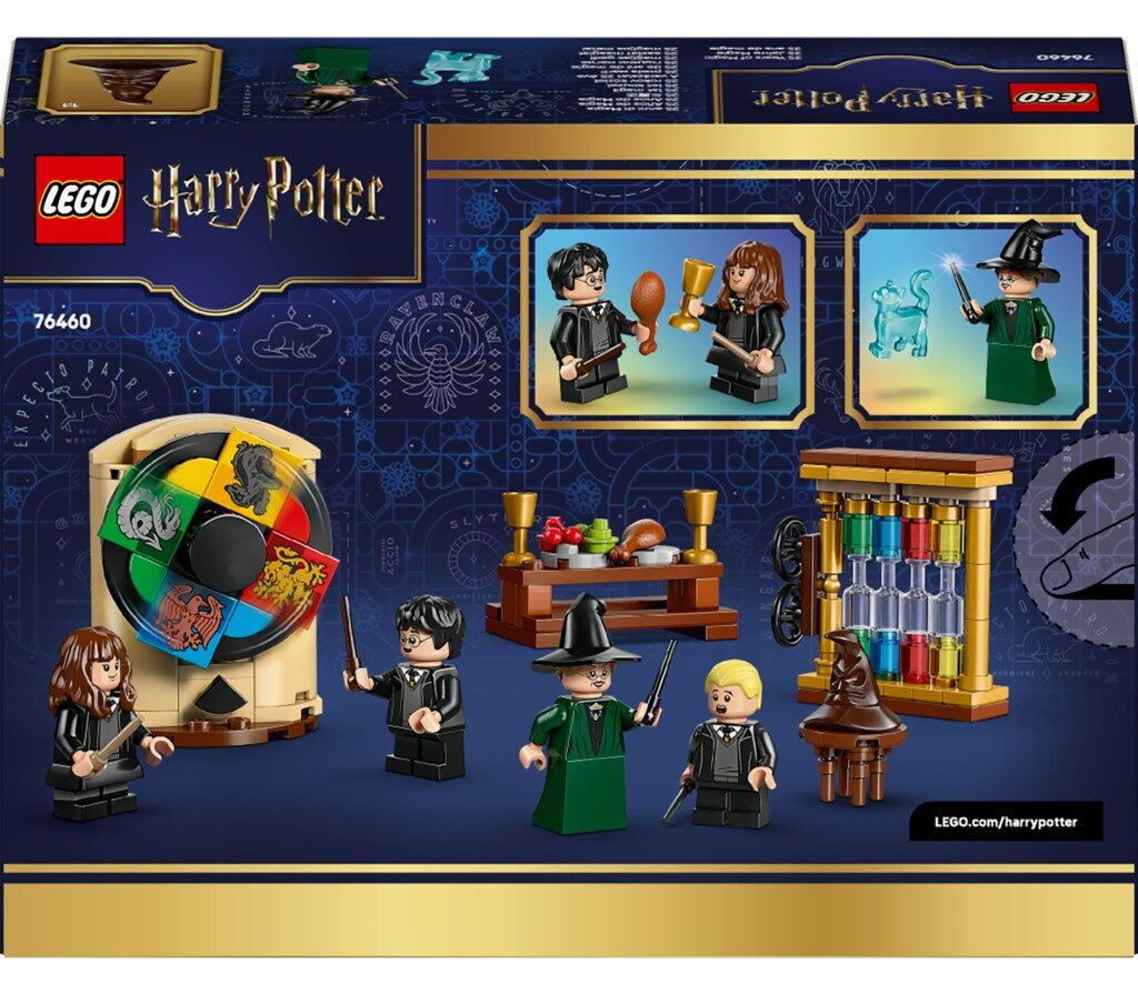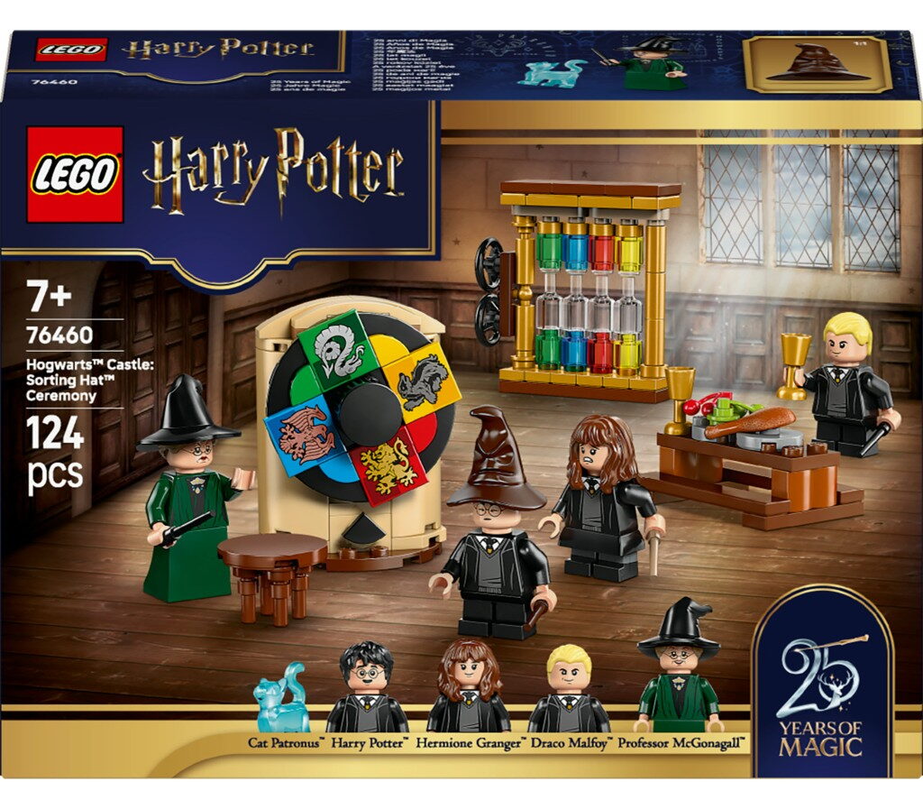 řipomeňte si ceremoniál s moudrým kloboukem v Bradavickém hradu z filmu Harry Potter a Kámen mudrců s touto stavebnicí LEGO® Harry Potter™ (76460) pro děti. Tato zábavná hračka Harry Potter pro holky, kluky a fandy od 7 let obsahuje 4 minifigurky LEGO Harry Potter: Profesorku McGonagallovou, Harryho Pottera, Hermionu Grangerovou a Draca Malfoye. Nasaďte moudrý klobouk na hlavu jednotlivých studentů a otočte „třídicím kolečkem“, abyste zjistili, do které bradavické koleje budou zařazeni. Součástí stavebnice je také jídelní stůl a počitadlo bodů pro jednotlivé koleje pro ještě více herních možností. Tato dobrodružná stavebnice pro děti vzdává hold vůbec první stavebnici LEGO Harry Potter™ (4701), která vyšla v roce 2001, a obsahuje jednu z řady sběratelských patronů k 25. výročí: patrona v podobě kočky profesorky McGonagallové! Tato stavebnice se vejde dovnitř modelu Bradavický hrad: Velká síň (76435), další stavebnice z řady modulárních stavebnic LEGO Harry Potter (prodávají se samostatně), jejichž spojením vytvoříte ten největší Bradavický hrad z kostek LEGO vůbec. Stavebnice obsahuje 124 dílků.