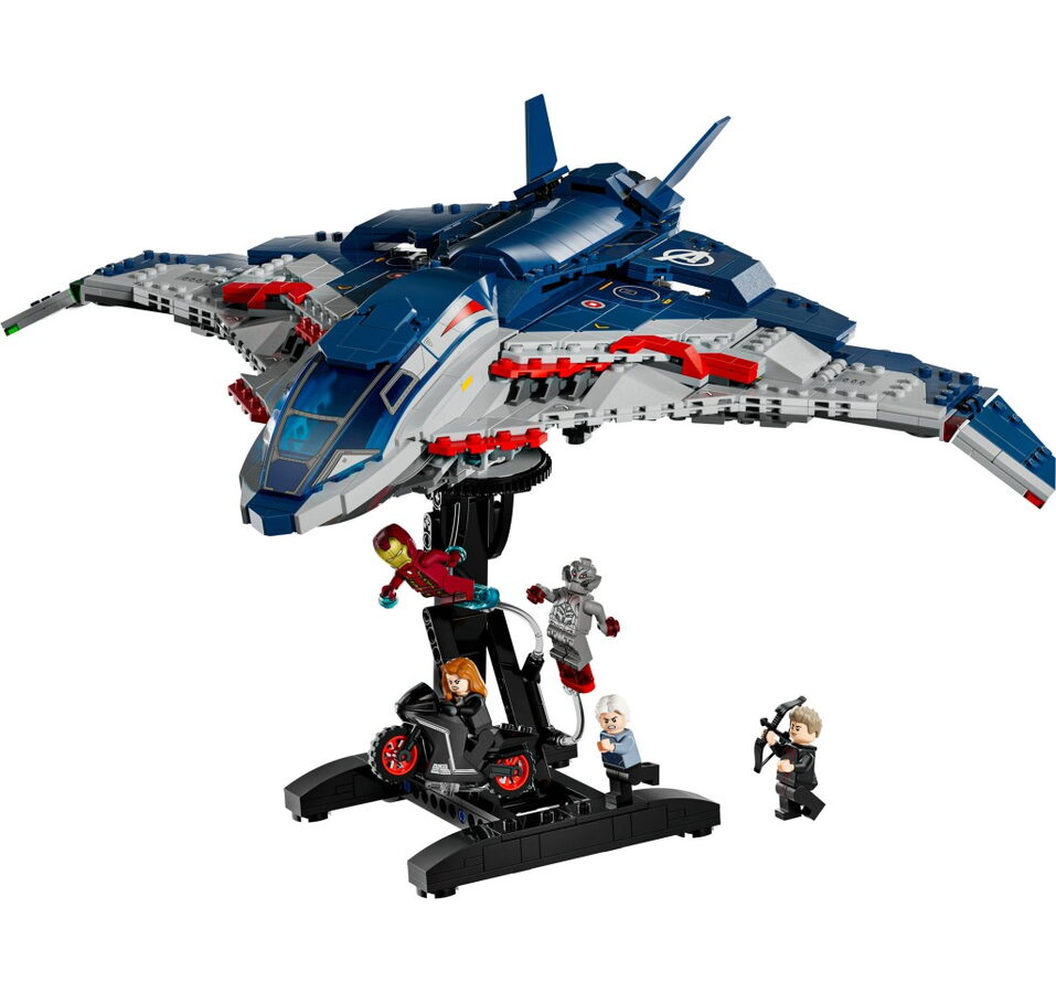 Quinjet Avengers – Letadlo má otevírací kokpit, 2 vystřelovače vpředu, úložný prostor na zbraně a otevírací zadní dveře, aby děti mohly vjíždět a vyjíždět s motorkou