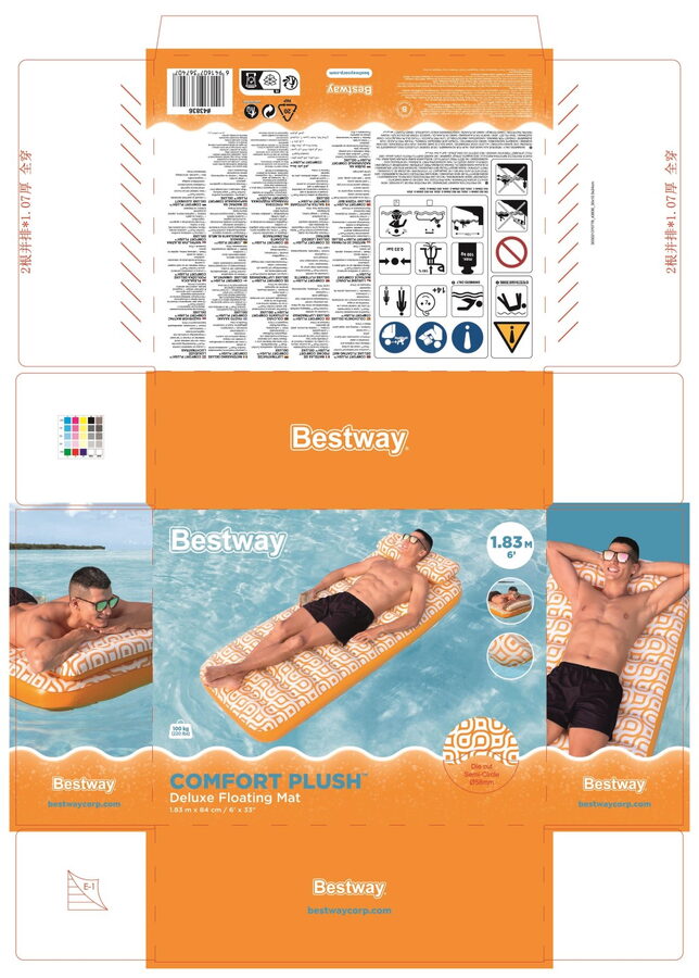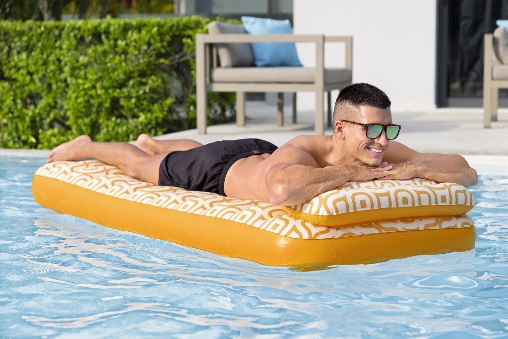Lehátko Comfort Plush™ má vodotěsný sametový povrch pro extra pohodlí, je o rozměrech 183×84 cm a maximální nosnost 100 kg. Lehátko má prémiovou konstrukci s vestavěným polštářem a má jeden držák nápojů. Matrace má dvě vzduchové komory a jeden držák na pití, opravná záplata je součástí balení.