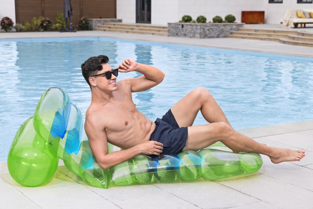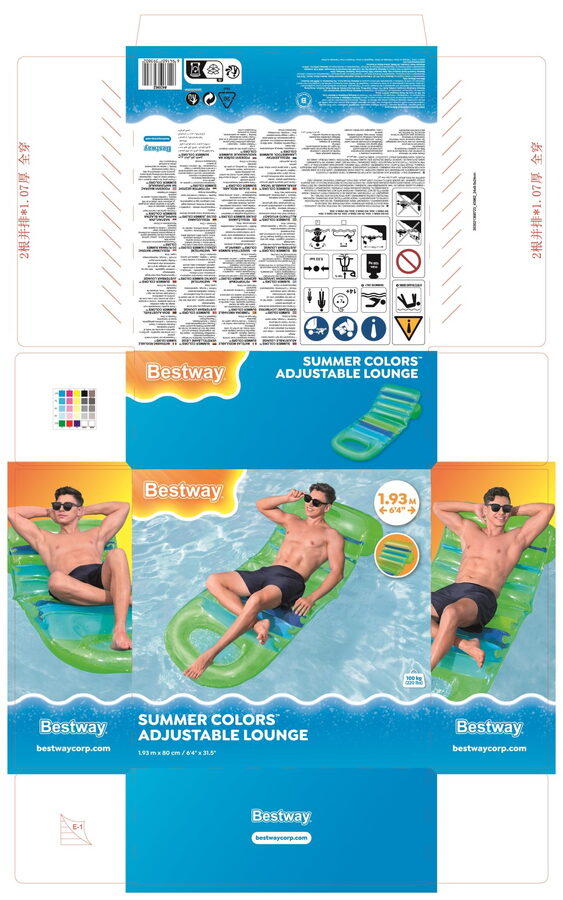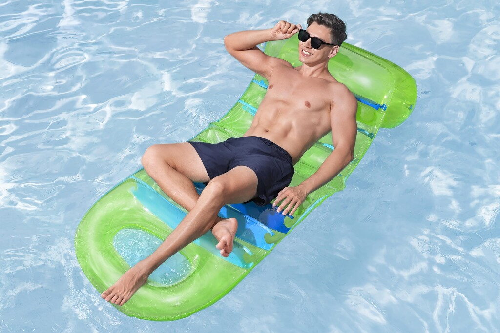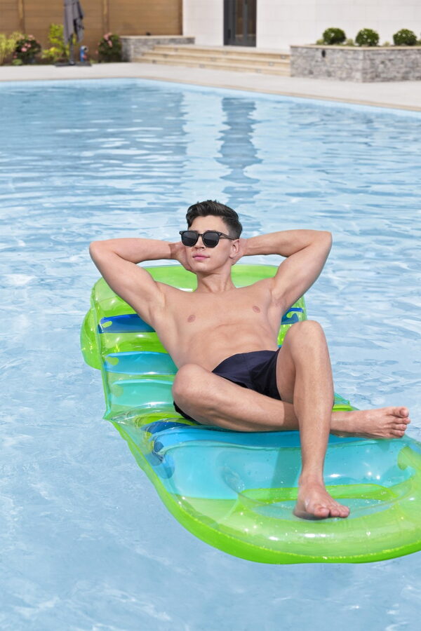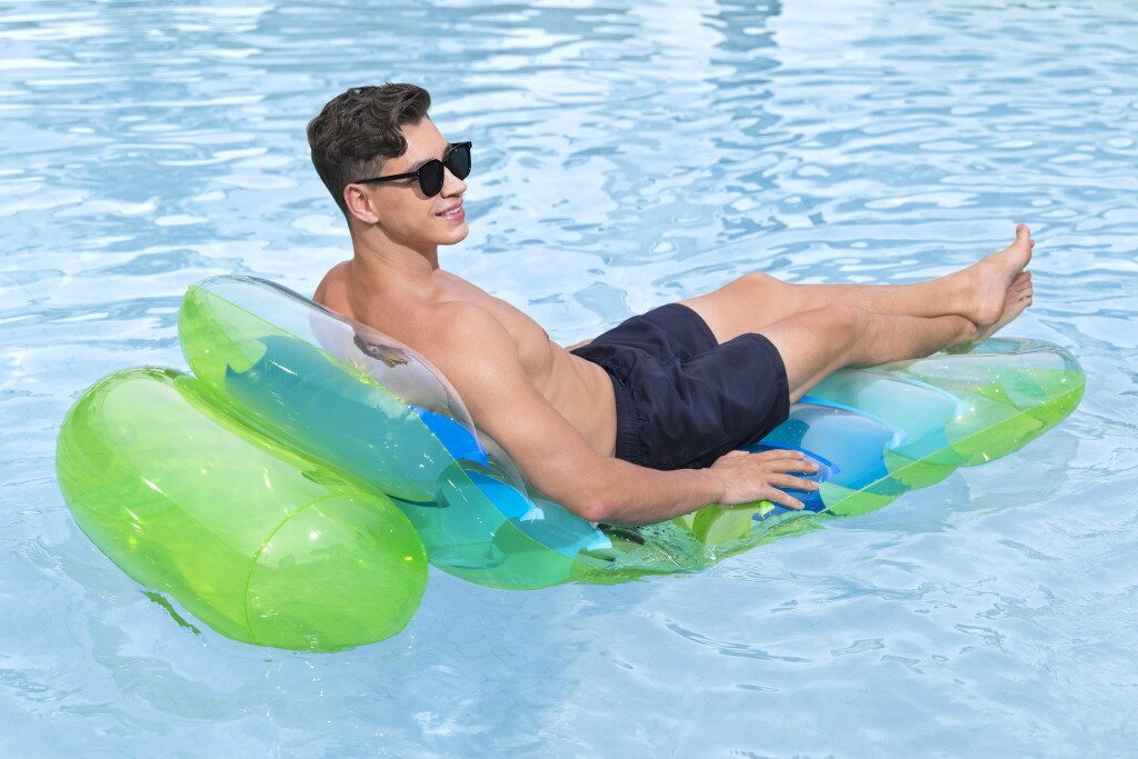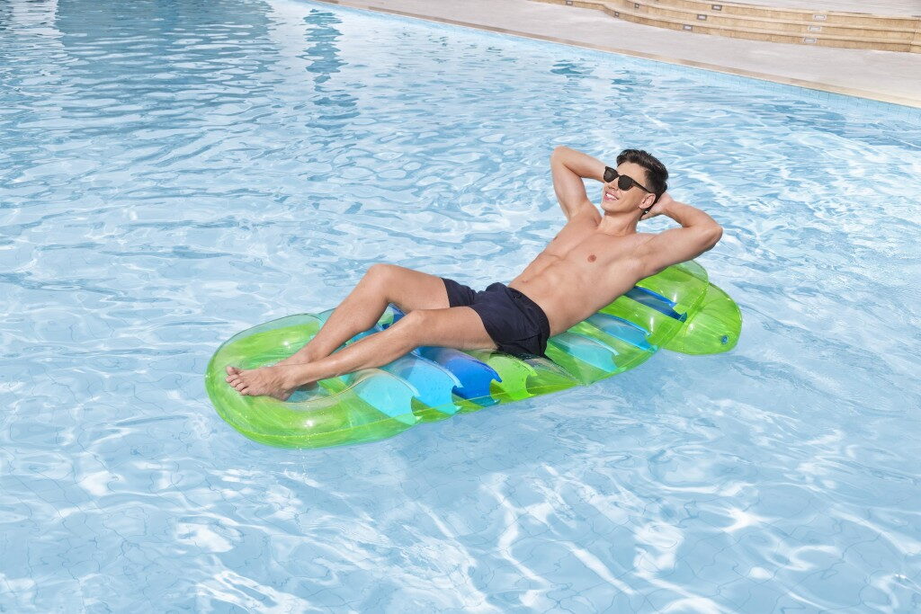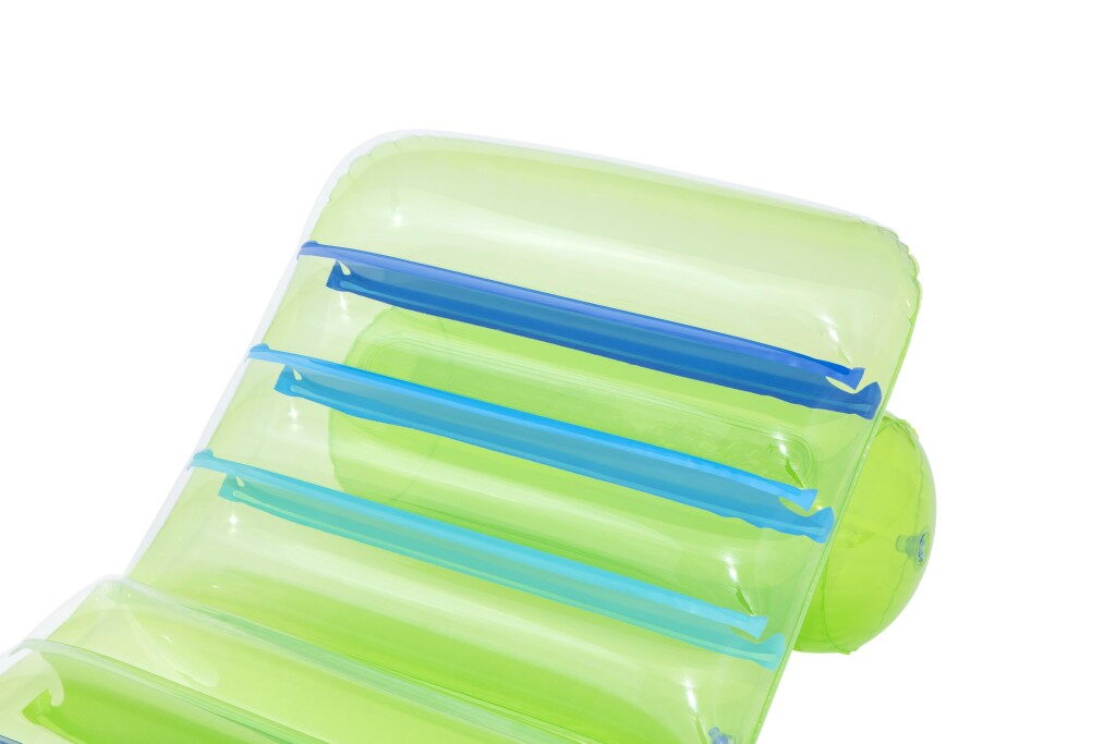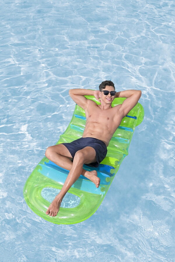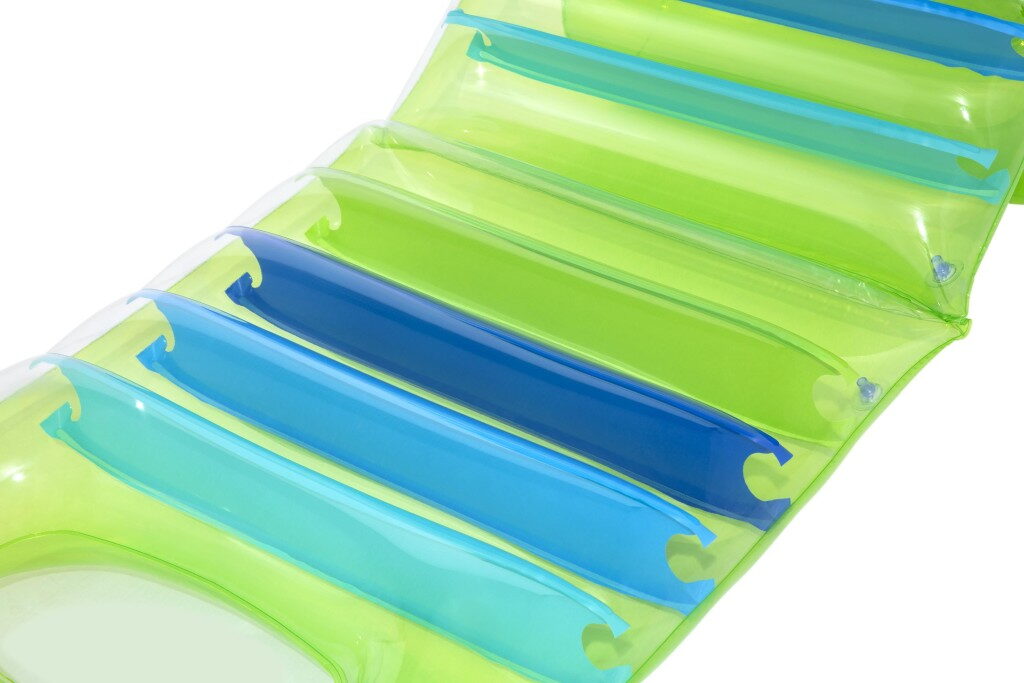 Lehátko s barevným designem a průhlednou vrchní stranou o velikosti 193×80 cm. Nastavitelné opěradlo – nastavte si sklon podle vlastních preferencí nebo úrovně pohodlí. Pevná konstrukce zajišťuje pohodlí. Maximální nosnost lehátka je 100 kg a lehátko má 3 vzduchové komory. Součástí balení je opravná záplata.