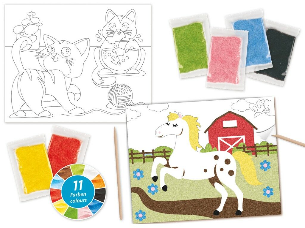 Tato nenáročná kreativní práce vyžaduje soustředění a dovednost. Budete nadšeni nádherným výsledkem. Sada obsahuje 2 motivy, koně a kočky. Písek v 11 barvách, který se sype na lepící podklad, pro vytvoření barevného obrázku. Hlavní vlastnosti: ideální pro rozvíjení zručnosti a kreativitypodporuje smyslový a hmatový rozvojjednoduché použitímotivy zvířat2 motivy, 11 barev