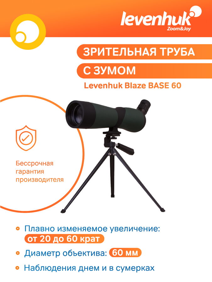Spektiv Levenhuk Blaze BASE 60 je výkonný optický přístroj s velkou aperturou, který disponuje funkcí zoom a šikmým okulárem. Bude ideální ke studiu velmi vzdálených objektů, protože nabízí maximální zvětšení 60x. Objektiv s velkou aperturou umožní provádět pozorování, i když světelné podmínky nejsou ideální: při východu slunce, během pošmourného dne nebo za soumraku. Souprava obsahuje malý stolní stativ, který je potřebný pro pozorování při velkém zvětšení: minimalizuje totiž chvění obrazu.