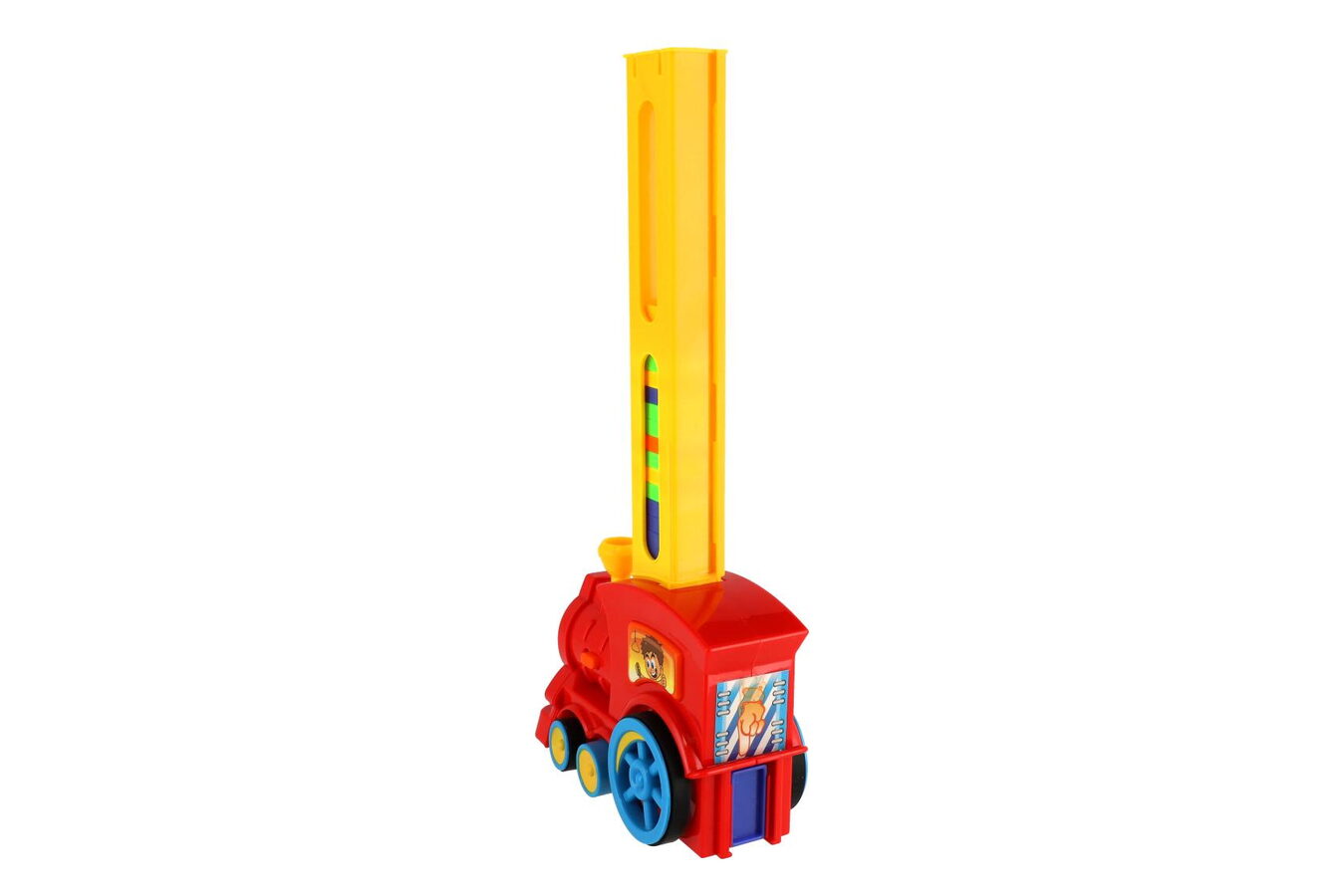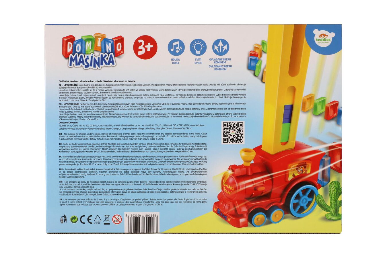 Lokomotiva skládající barevné domino 60ks. Vláček za jízdy staví řadu z domina, kterou můžete zbourat. Při nárazu vláček změní směr jízdy a jede dál, otočením komínku mašinky změníte směr, při jízdě svítí a cinká. Baterie 2x AA nejsou součástí balení.