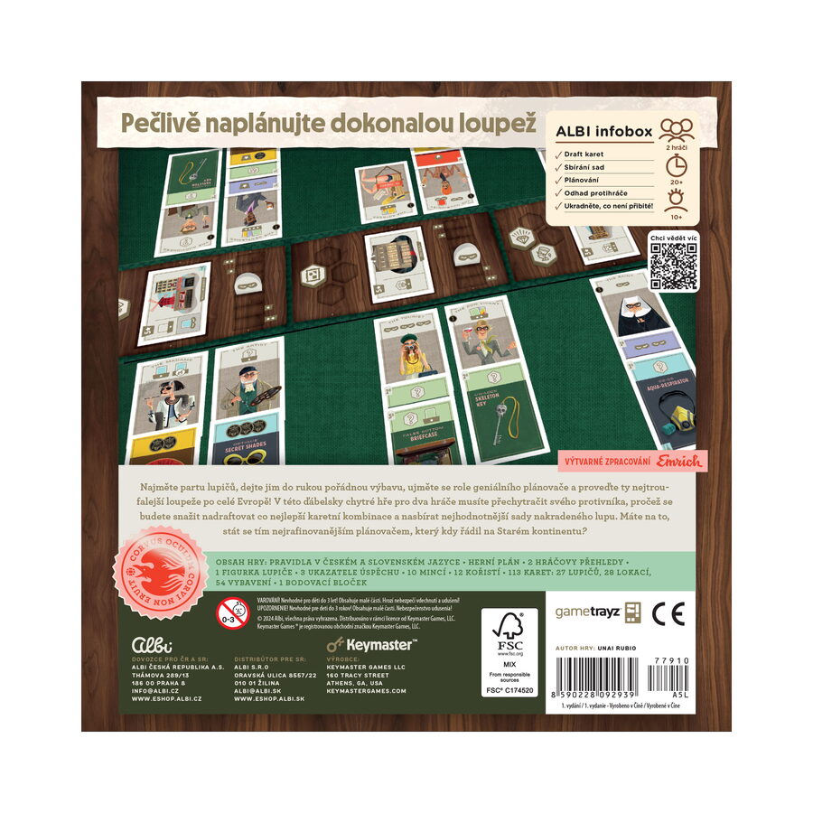 Najměte partu lupičů, dejte jim do rukou pořádnou výbavu, ujměte se role geniálního plánovače a proveďte ty nejtroufalejší loupeže po celé Evropě! Hra pro dva hráče. Hra obsahuje: herní plán, 2 přehledy, 1 figurku lupiče, 3 ukazatele úspěchu, 10 kartonových mincí, 12 kořistí, 113 karet (27 lupičů, 28 lokací, 54 vybavení, 4 přehledové karty lokací), 1 bodovací bloček a pravidla.