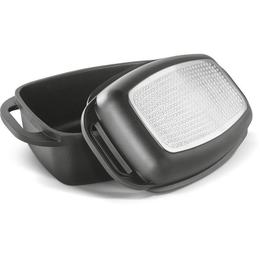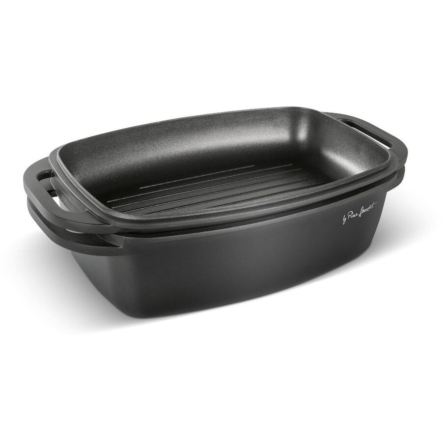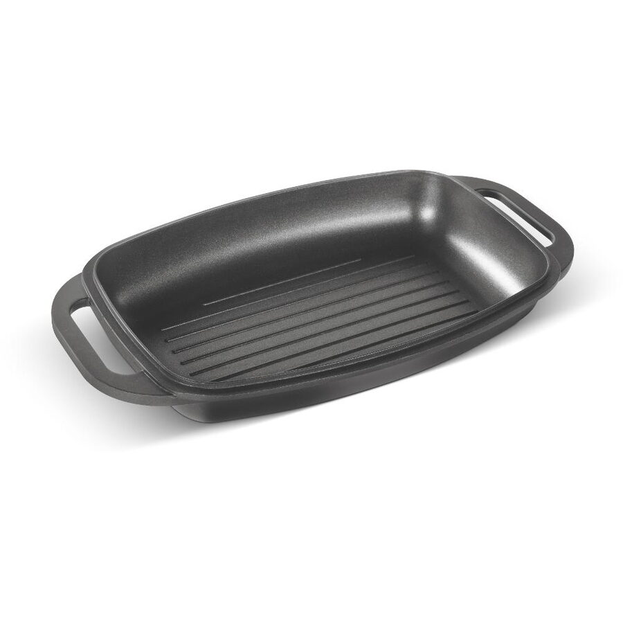 Kvalitní hliníkový litý pekáč a grilovací víko s vnitřním nepřilnavým povrchem odolným proti připalování, opatřen silným dnem u obou nádob.