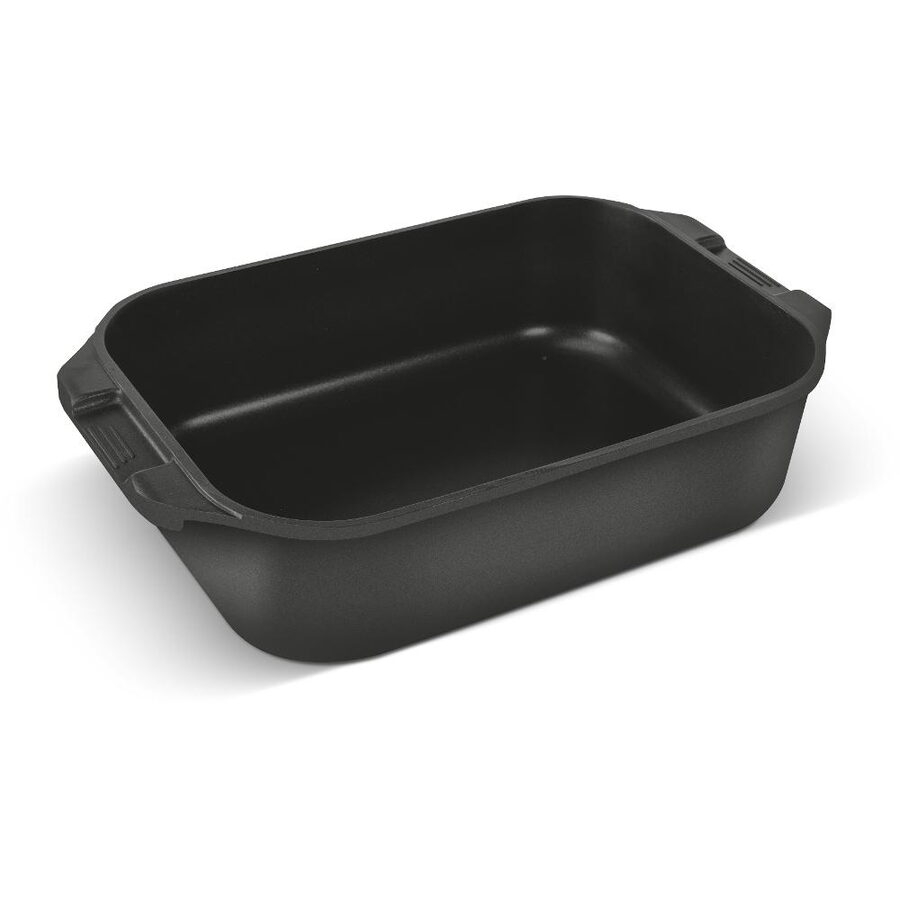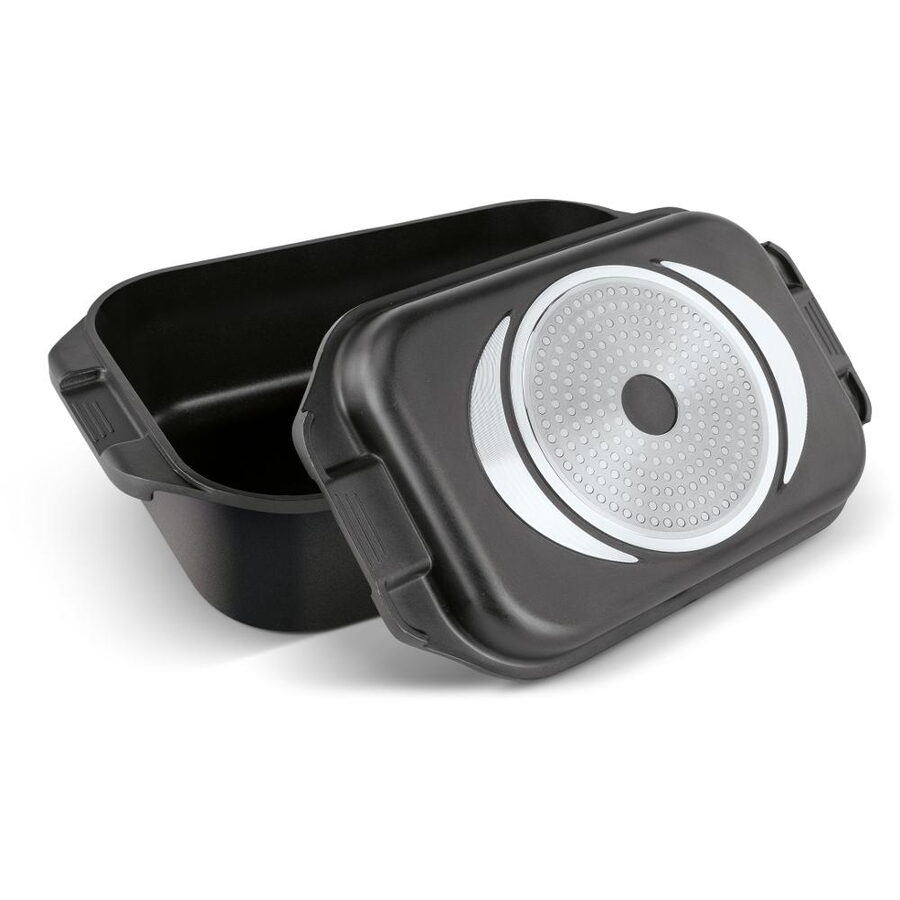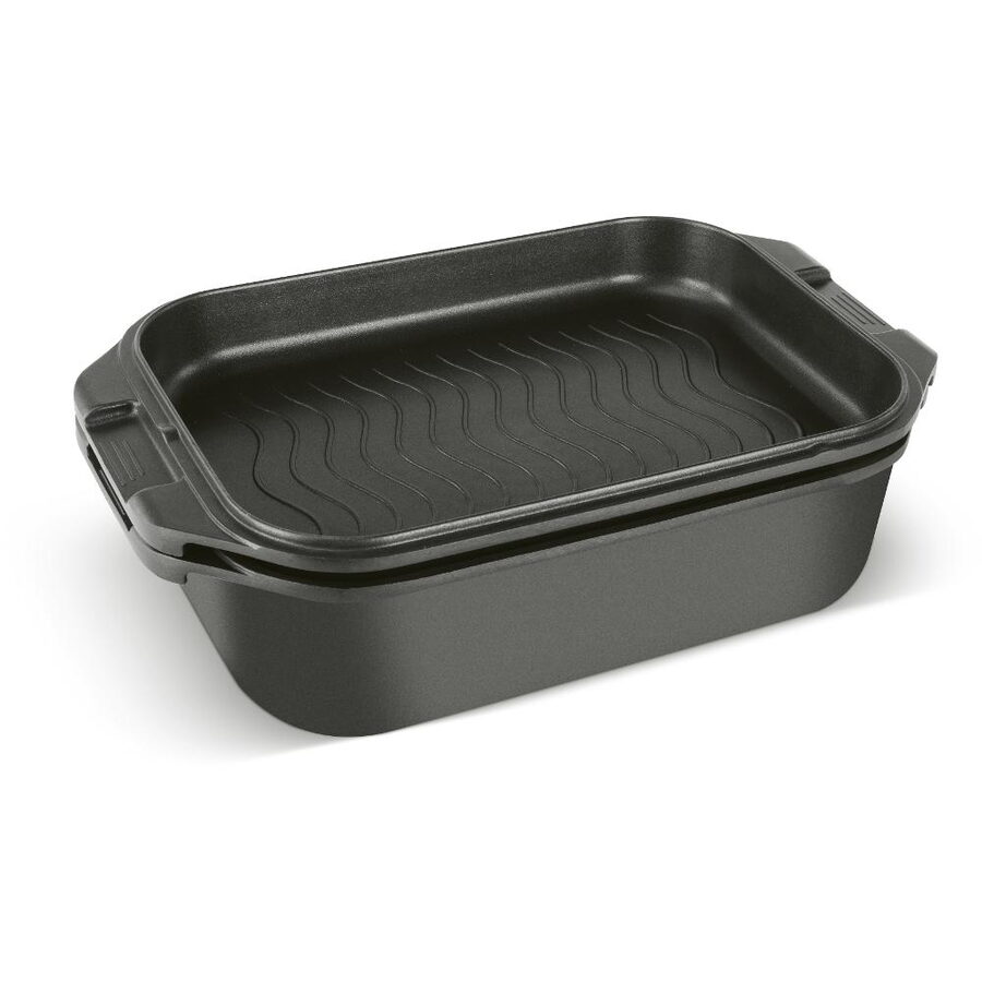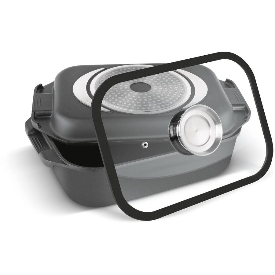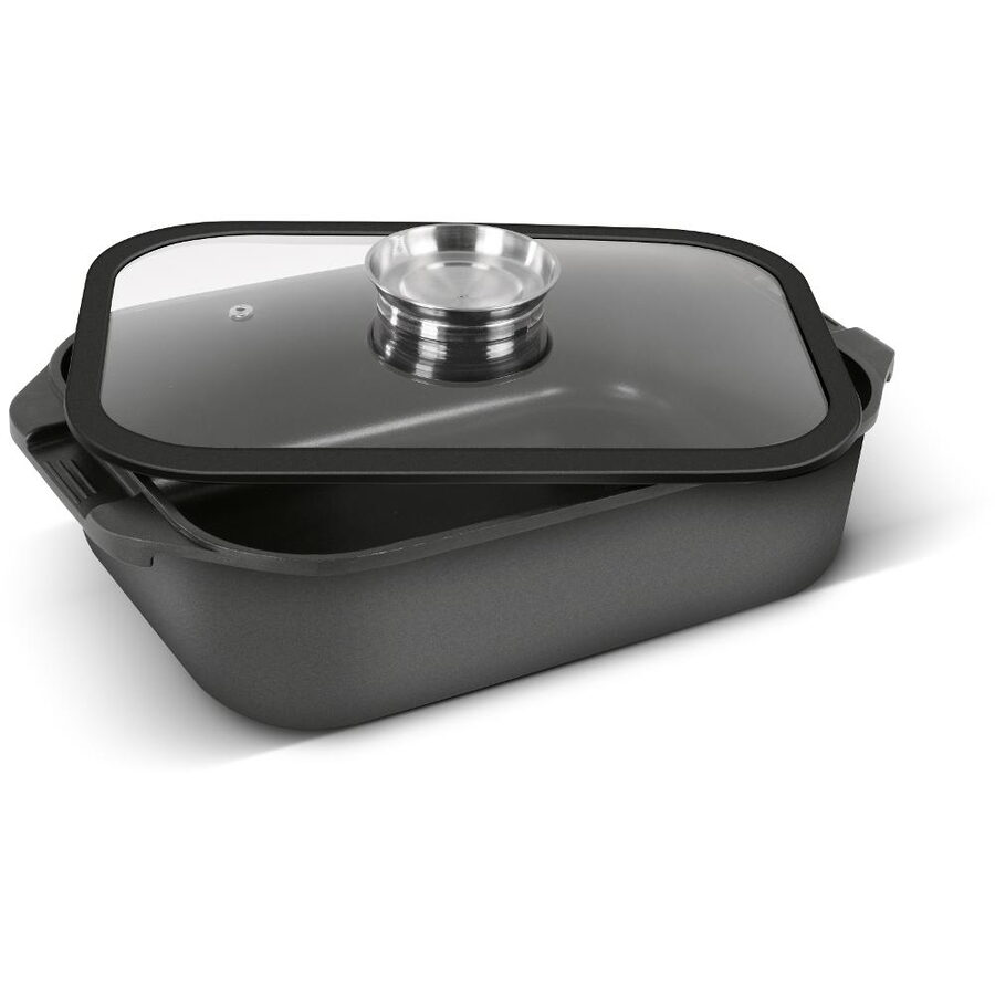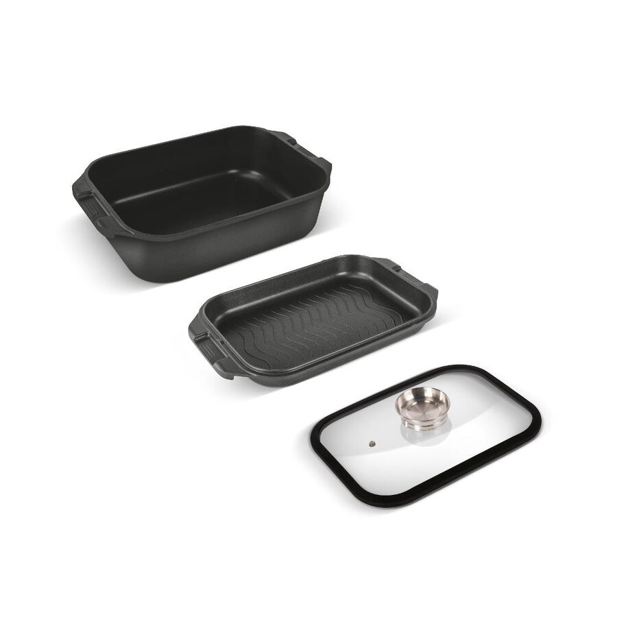 Kvalitní hliníkový litý pekáč, skleněné víko z borosilikátového skla a grilovací víko s vnitřním nepřilnavým povrchem odolným proti připalování, opatřen silným dnem.