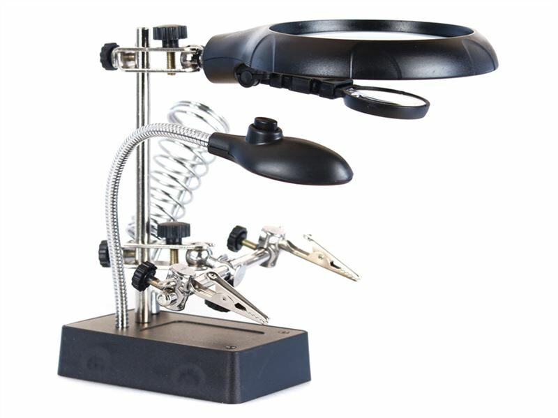 tři lupy, držák nástrojů, ruční svěrky, držák