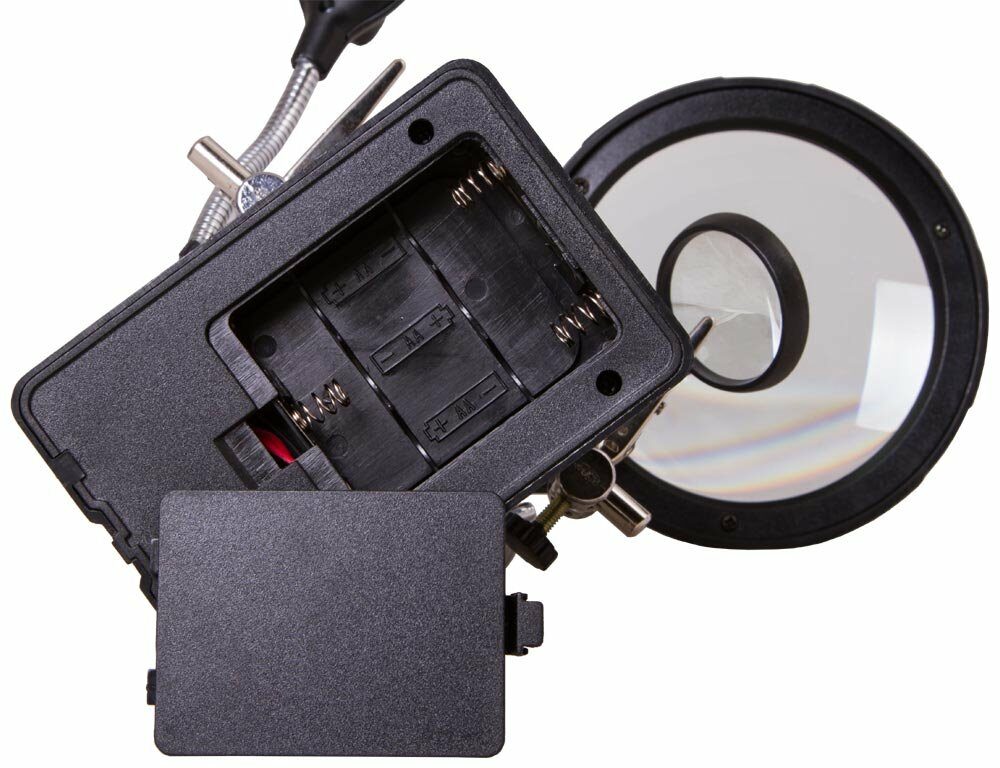 Na výběr máte jednu pevnou čočku (2,5 x) a dvě výměnné čočky s přiblížením 7,5 x a 10 x. Pevná lupa má průměr 90 mm a vedlejší 34 mm. Ty můžete nacvaknout do nastavitelného držáku ve spodní části pevné lupy. Osvětlení pracuje s pěti LED, které jsou napájené adaptérem AC, nebo třemi AA bateriemi (nejsou v balení).